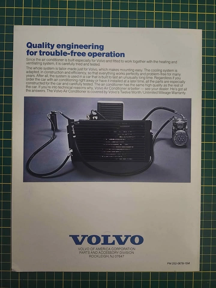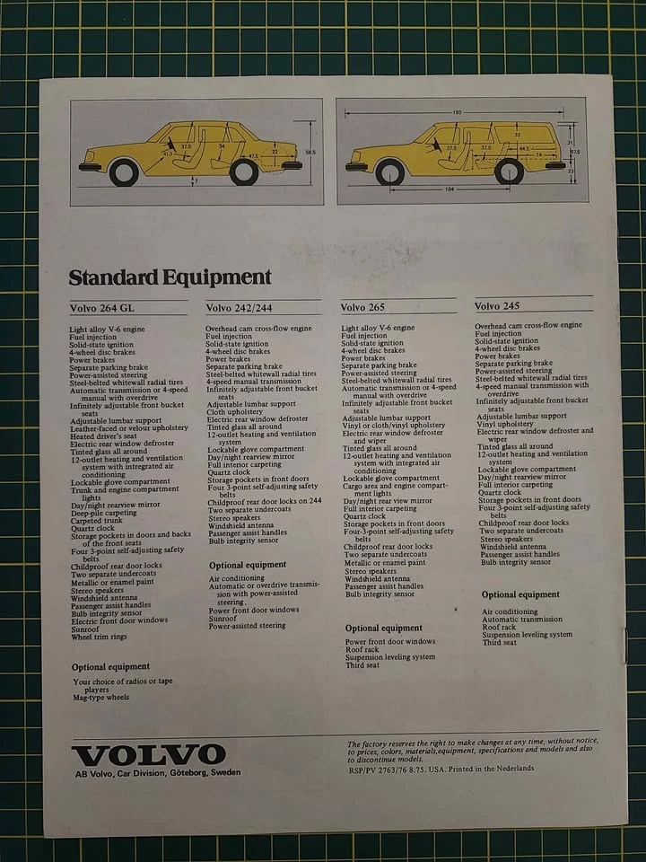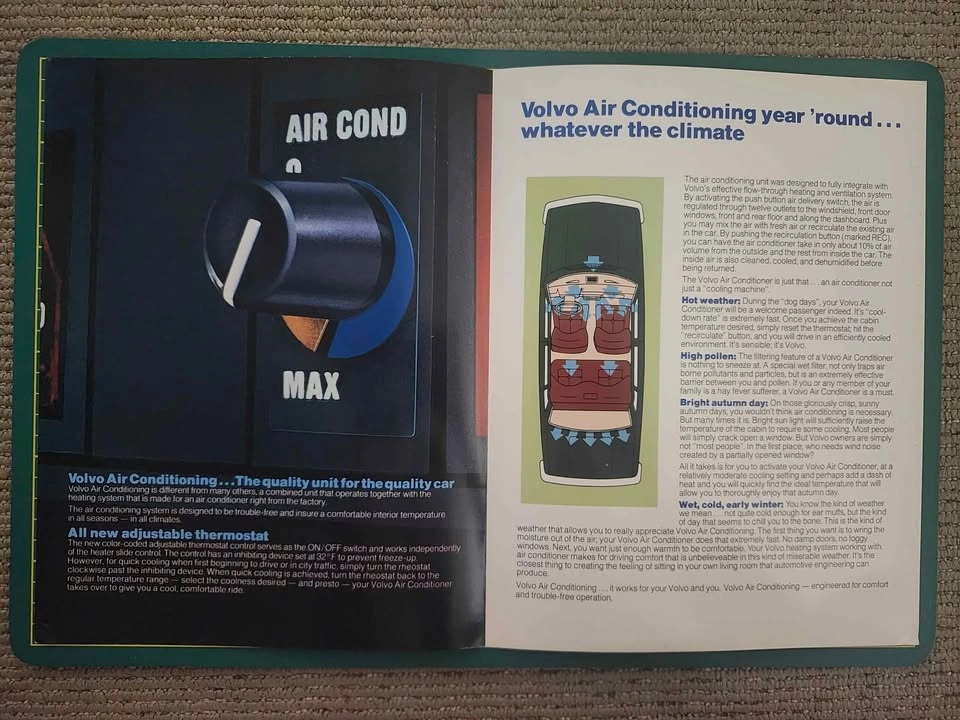 441976 Volvo Brochure - Showcasing their lineup during that time, includes the 264 GL, 242/244, 265, 245 + Pages showcasing car color ans upholstery options Volvo Air Conditioning - Informative brochure explaining their "new" air conditioning system Volvo 1978 Color and Upholstery - Brochure showcasing colors and upholstery options. All brochures are 27cm x 22cm Cash only Pickup at East Credit