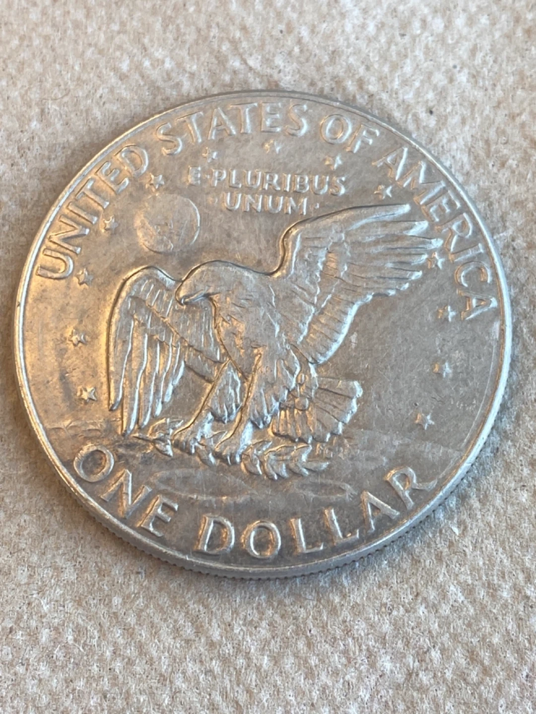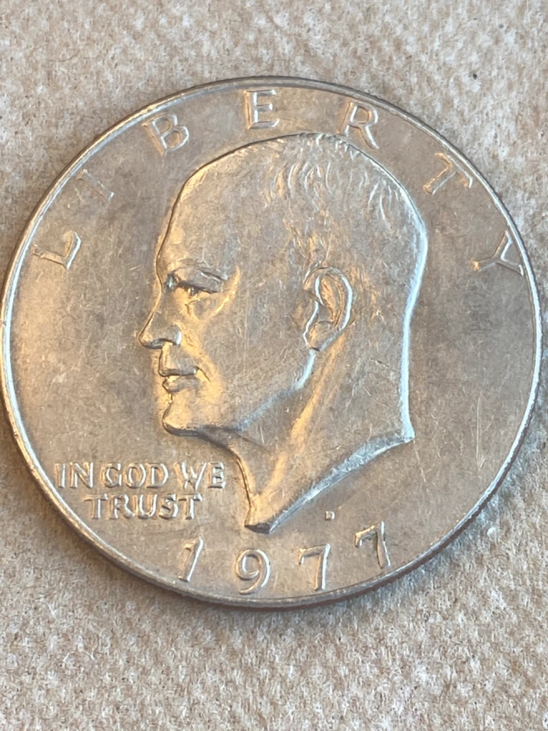 Selling a 1977Eisenhower dollar coin. It has the words "In God We Trust" on it.
