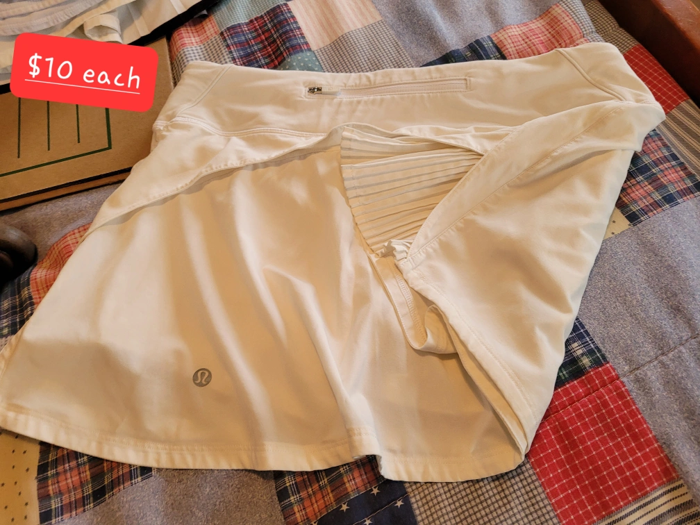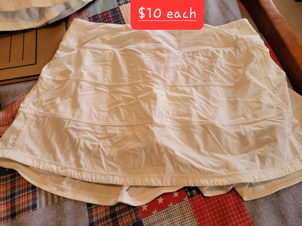 tops $5/, yoga pants $40 , 3 same style skorts $10/each, 2 other styles $10 ea,