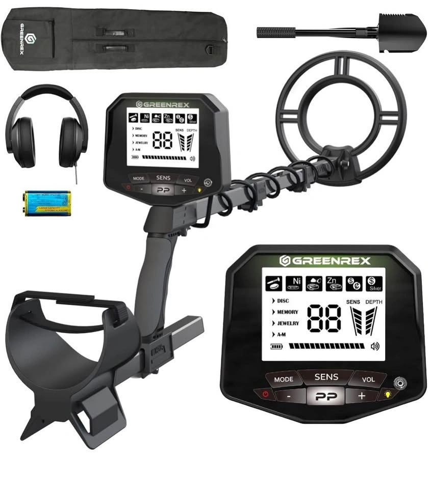 Brand new, never assembled GreenRex Metal Detector for Adults Professional. Waterproof pinpoint, high accuracy for gold and silver detection. Suitable for underwater and beach use. Features a 10'' IP68 coil, bigger LCD, and a new advanced DSP chip. The GreenRex Metal Detector has 5 upgraded modes for precise, efficient metal detection. Find coins, relics, jewelry, or gold. Adjustable length up to 132 cm, fits adults and kids. Compresses to 62 cm for easy travel. Includes 5 sensitivity levels to adapt to different ground conditions. Comes with premium headphones, a foldable shovel, batteries, and a carrying bag.