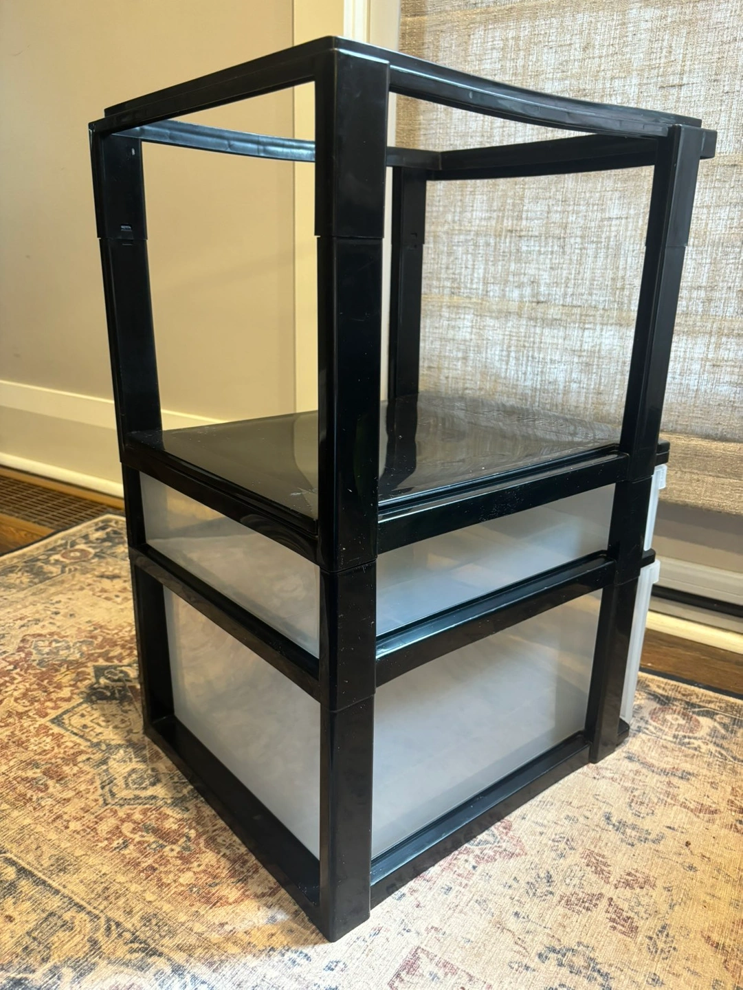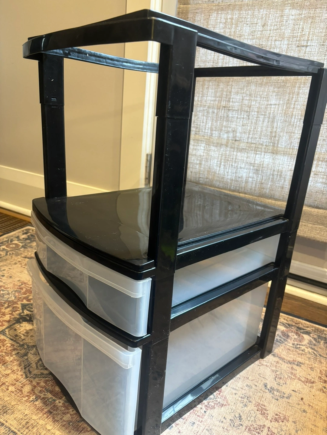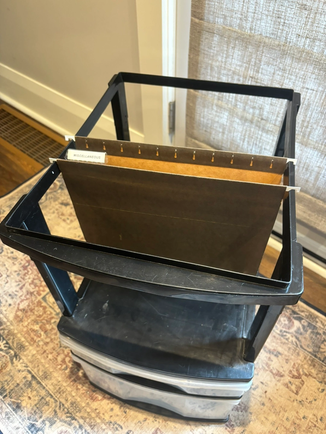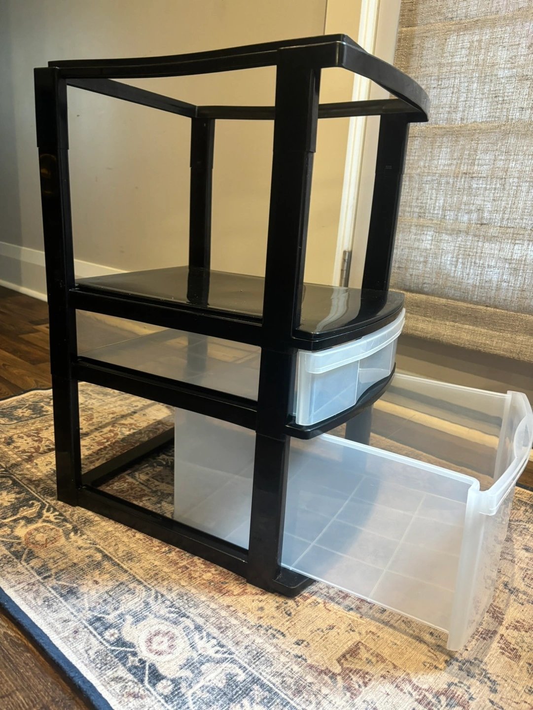 Letter size and legal size hanging file organizer with one large drawer and one small drawer for office supplies. Black and clear plastic. Sturdy, no damage or cracks.