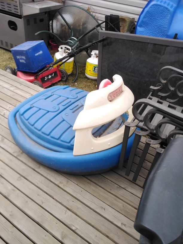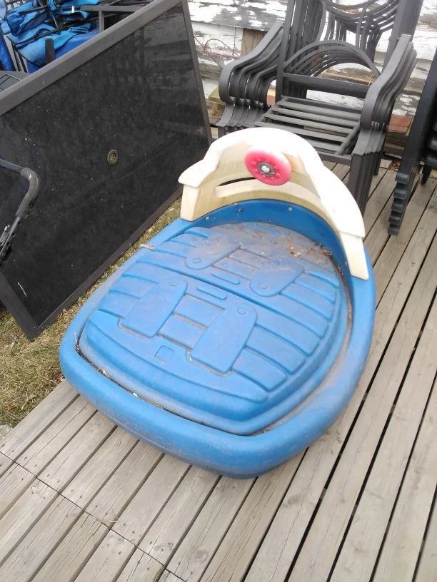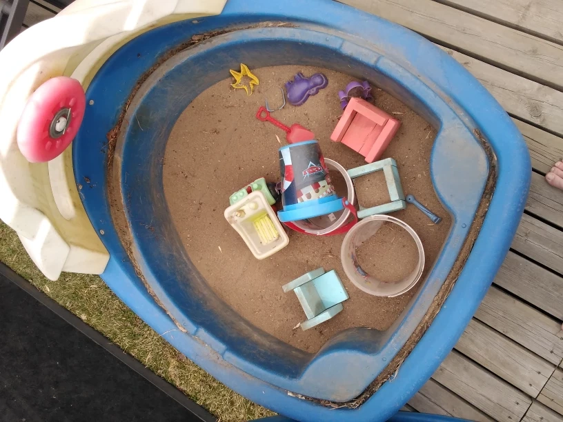 Well loved tug boat sandbox that has a cover, so you won't be the community litter box.