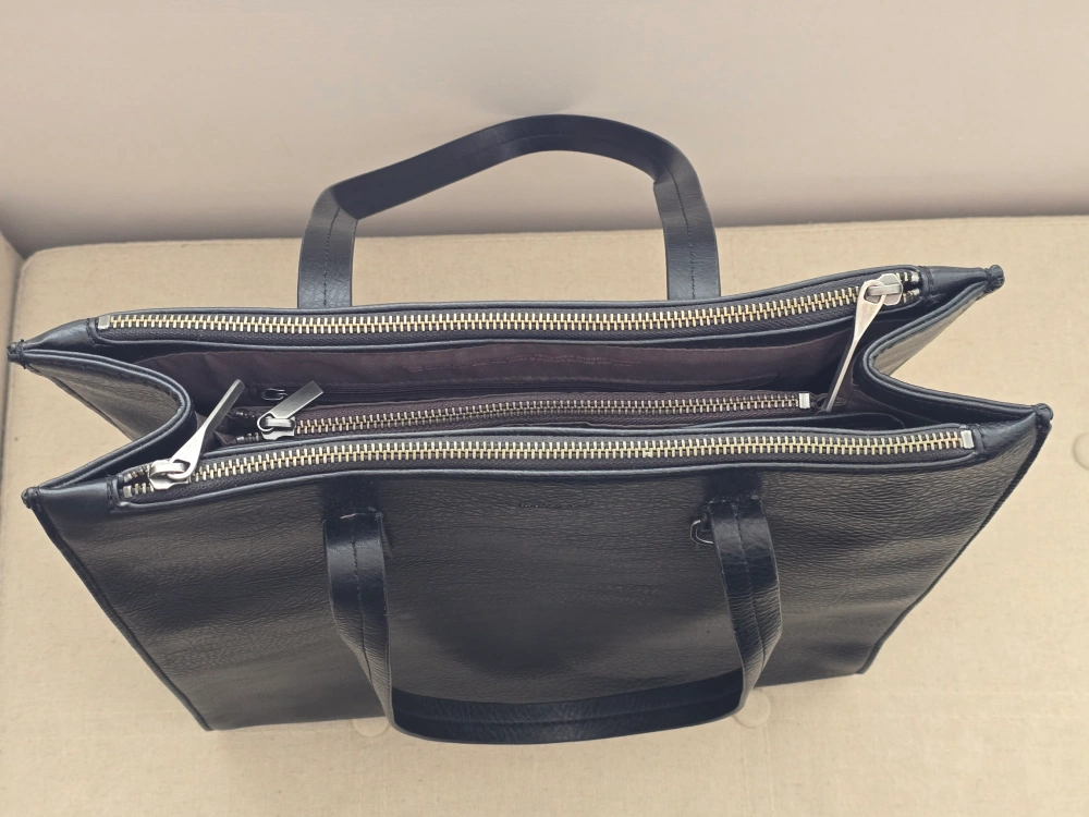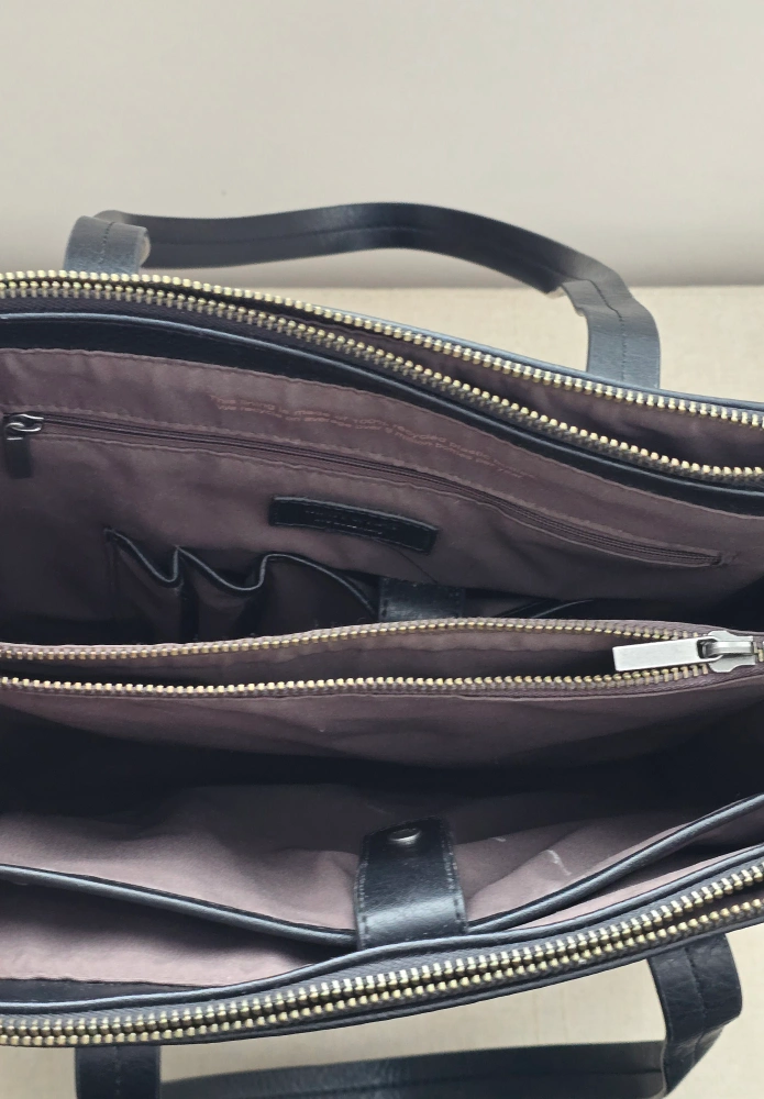 The north/south tote has five compartments: Front, back, and center zip compartments, with open compartments in between.