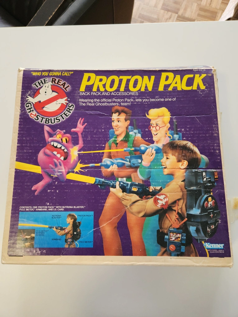 1984 Vintage Kenner toy with proton pack, proton blaster, arm band, and PKE meter.