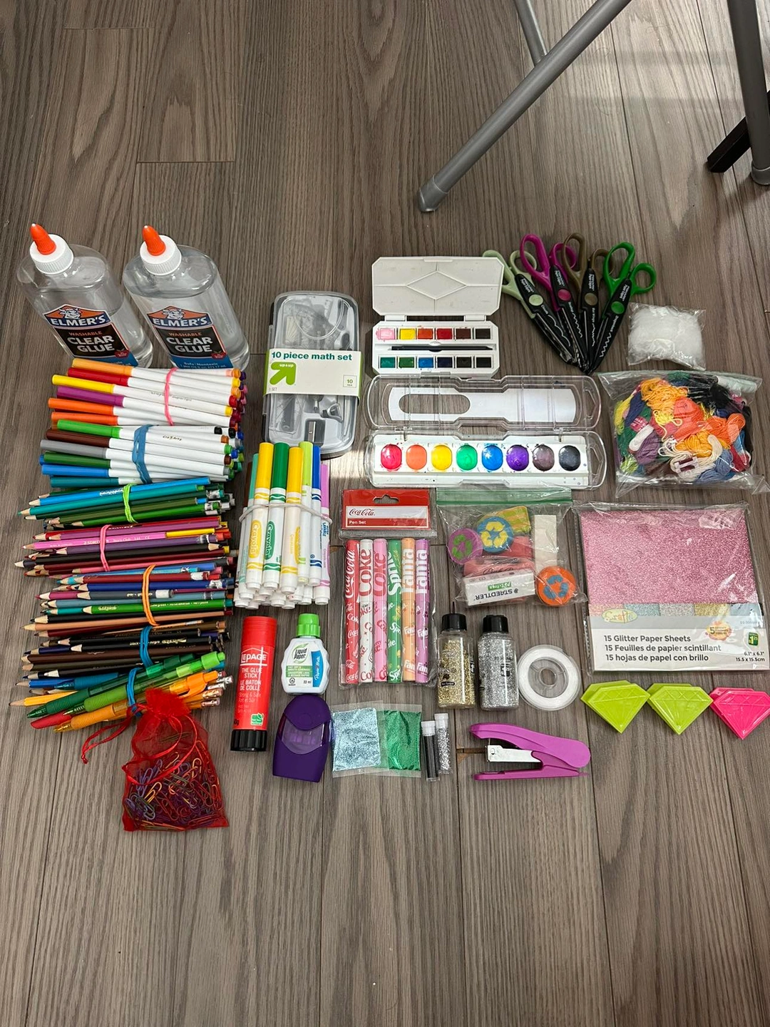 Glue, crayola markers, pencil crayons, pencils, glue stick, white out, pencil sharpener, glitter, glitter sheets, stapler, string, erasers, clips, paint, scissors with multiple cutting shapes, 10 piece math set all worth more than 100 selling for 50!