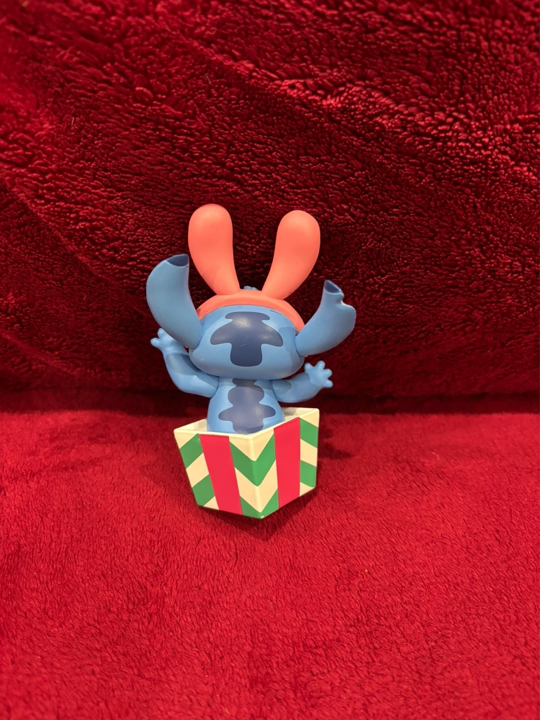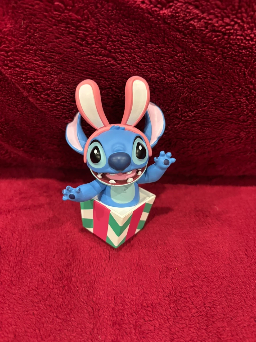 This cute Stitch figurine is dressed in bunny ears and popping out of a gift box. It's a fun collectible for any Disney fan. Perfect for display on a shelf or desk!