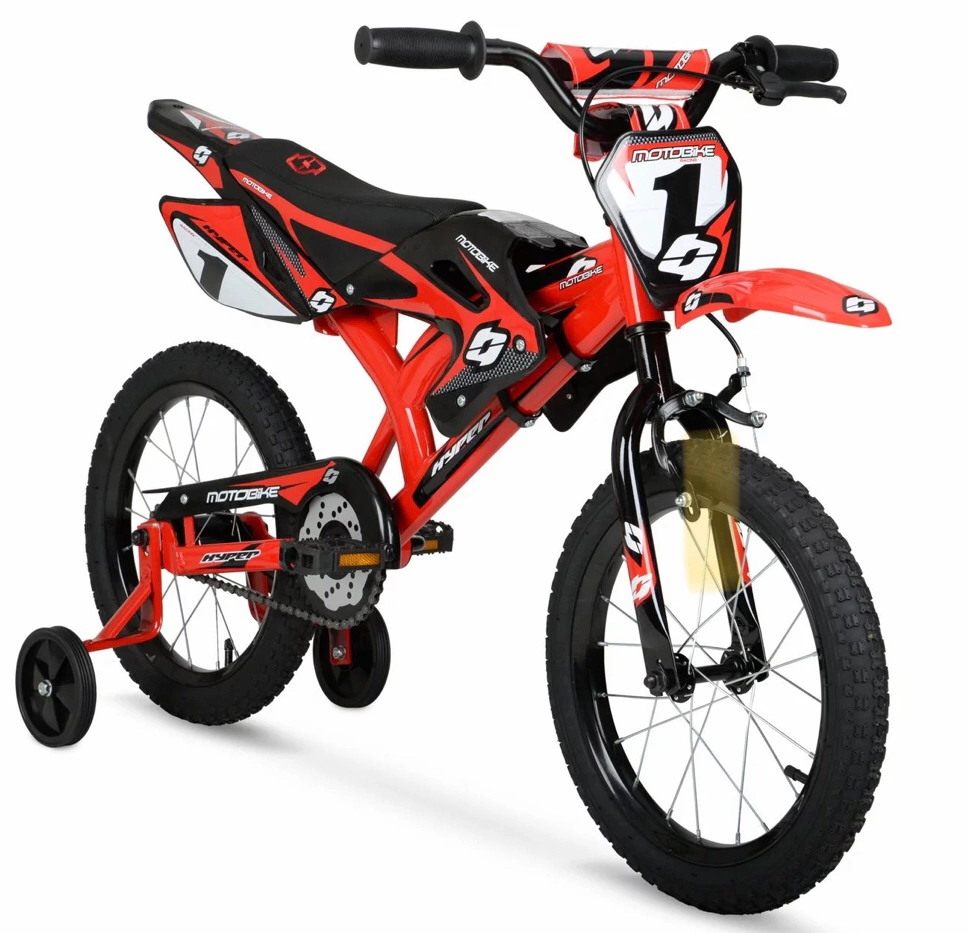 The 16" Hyper Bicycles Motobike is a steel-framed bike for beginner riders. great to learn how to ride while enjoying the experience. The bike features a durable steel frame that provides stability and ease of riding, training wheels for added support. Comes with padded handlebar featuring BMX grips for comfortable gripping. The performance-oriented BMX steel frame with motocross-style fenders and saddle.