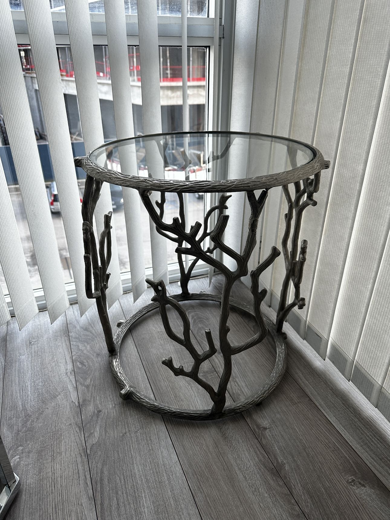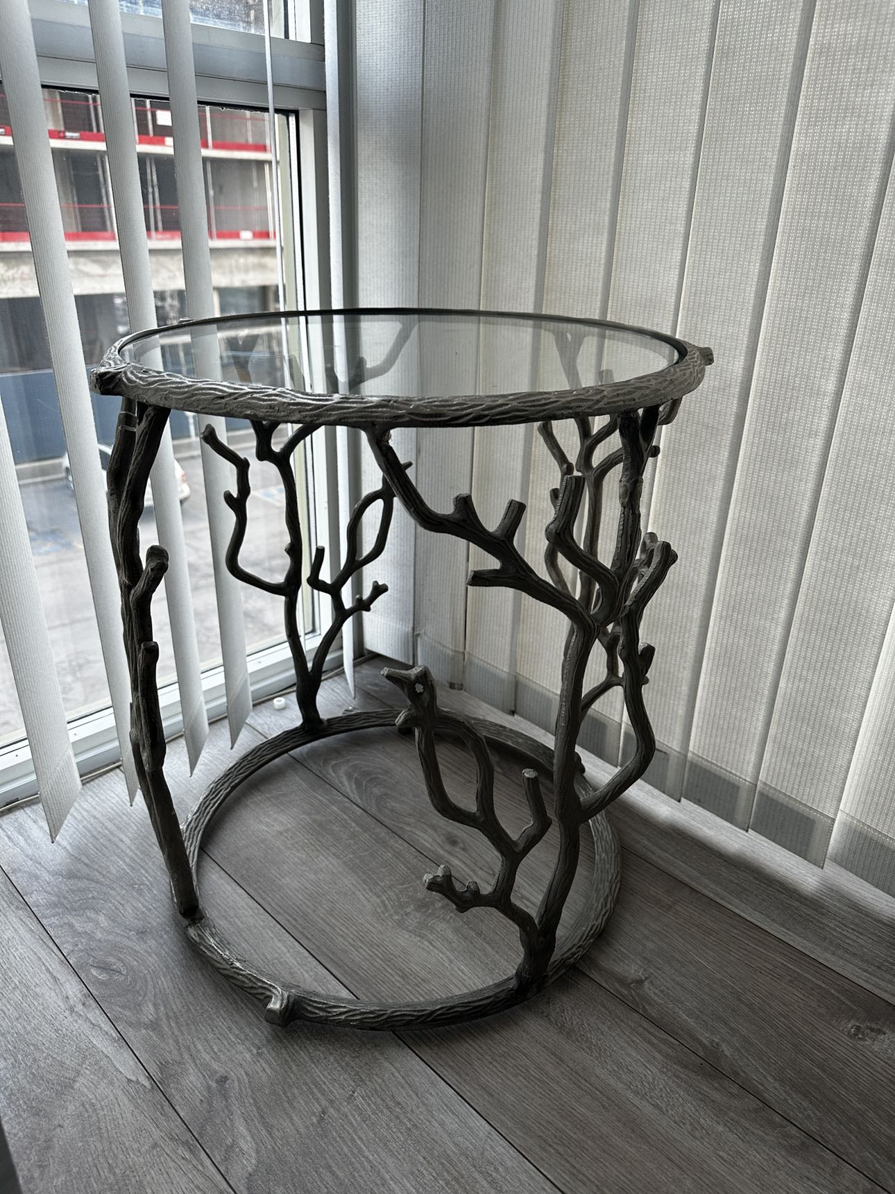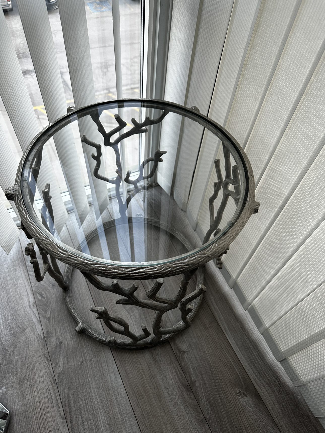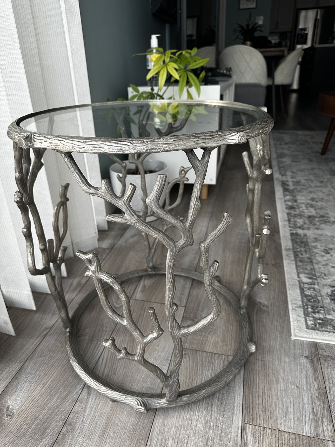 Stunning modern accent/ end table with branch design. Glass top and silver metal finish.