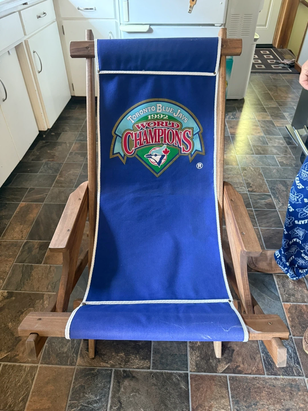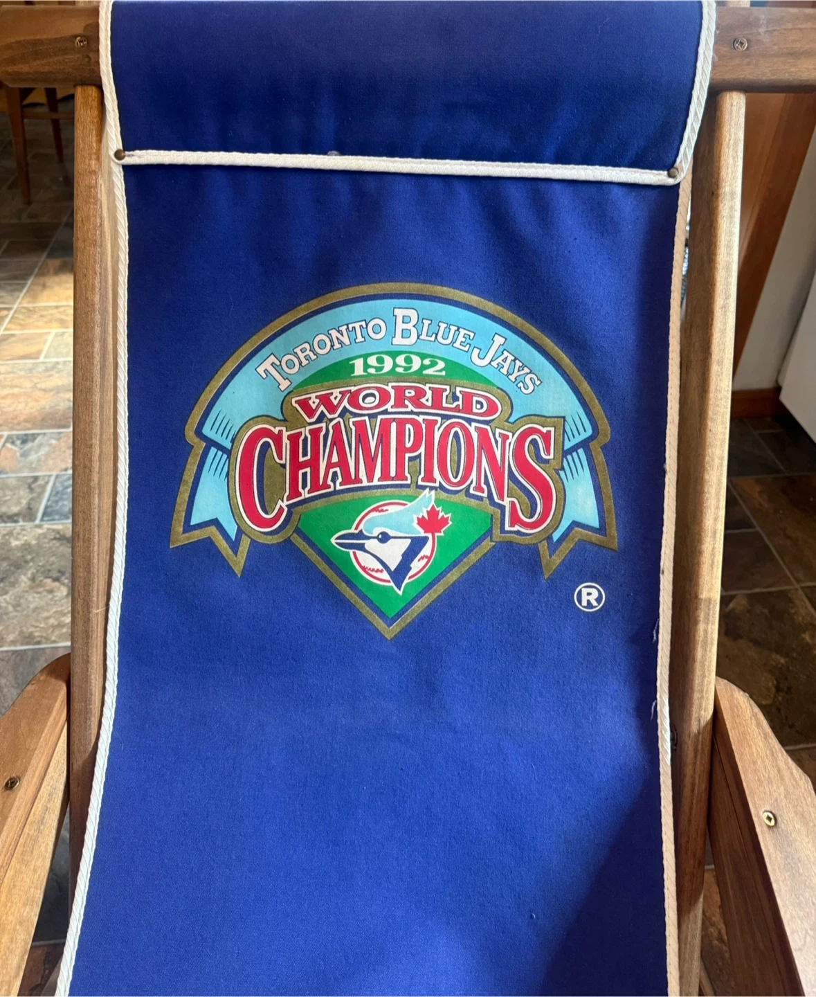 37Selling a unique Toronto Blue Jays 1992 World Champions sling back chair! It is in great shape and features their iconic World Series win for any Blue Jays fan looking to add some vintage flair to their patio or deck this is a win