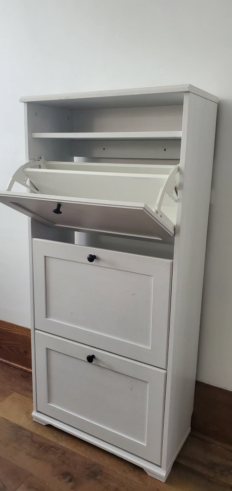 IKEA Brusali Shoe cabinet, as good as new. Three compartment, white, and adjustable dividers inside shoe compartment. No scratches. Please pick up. Cash preferred.
