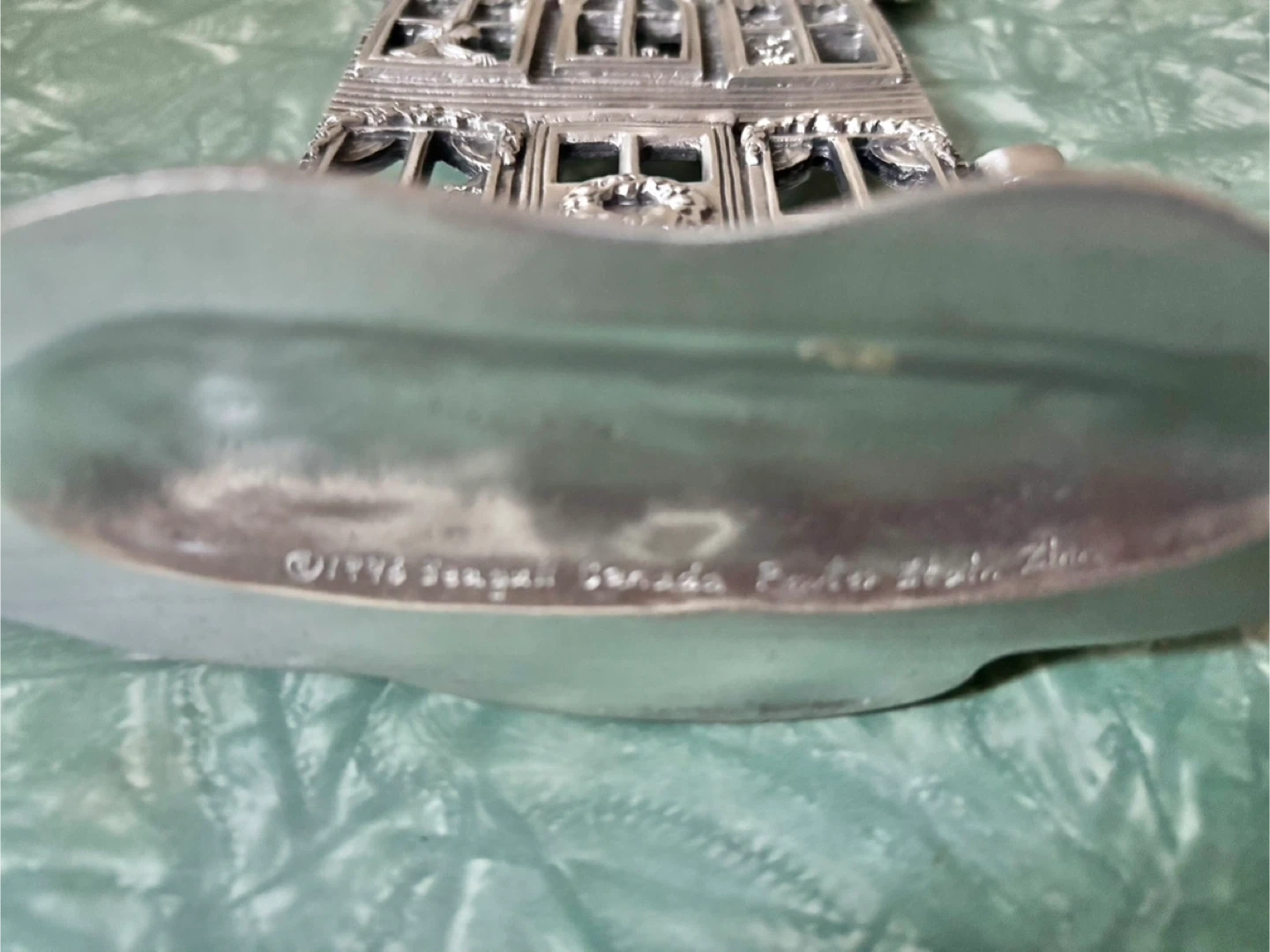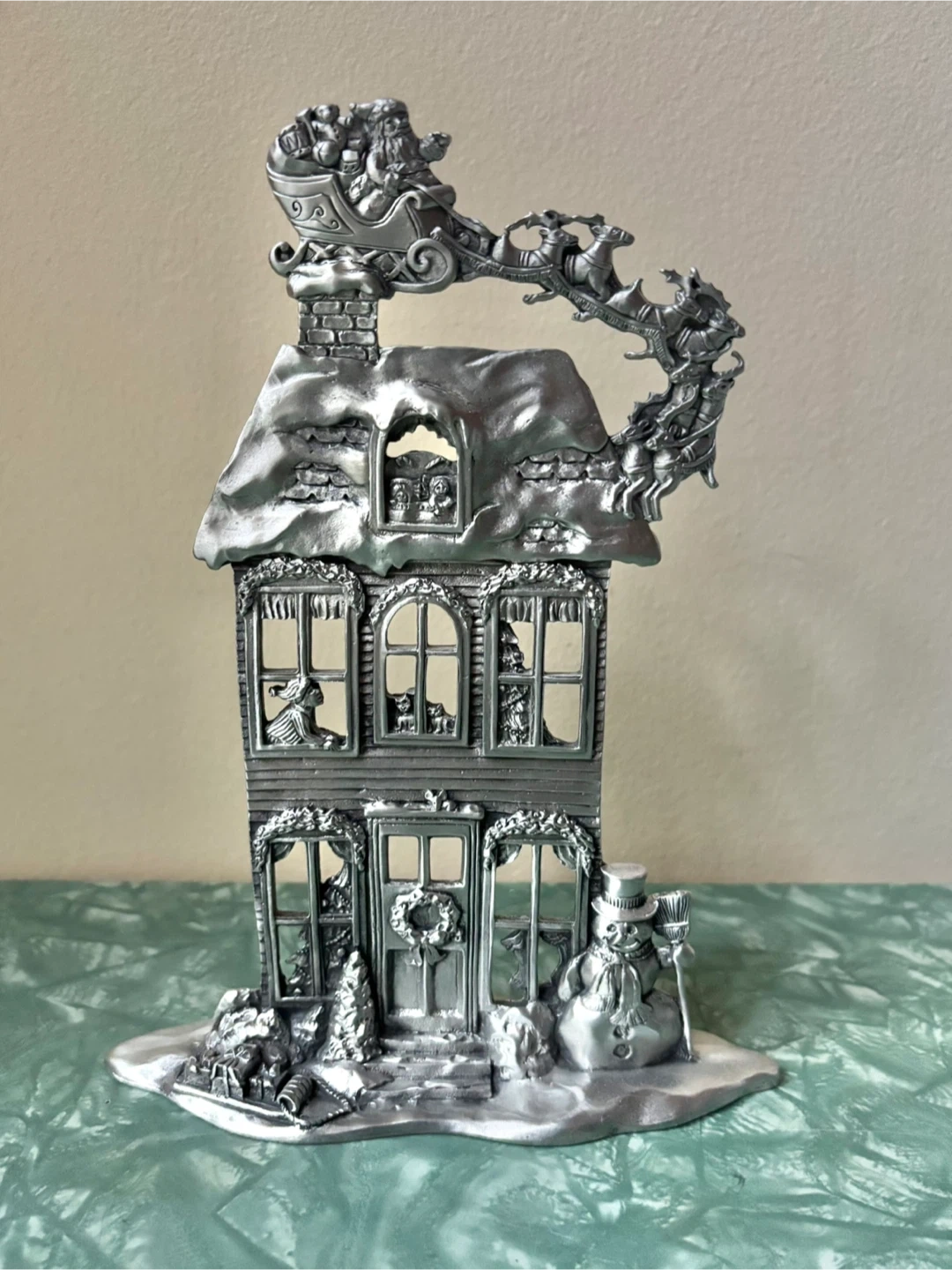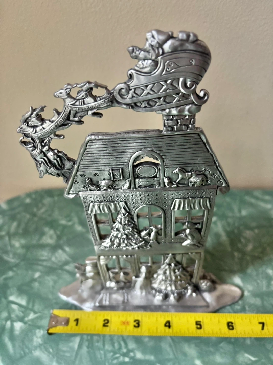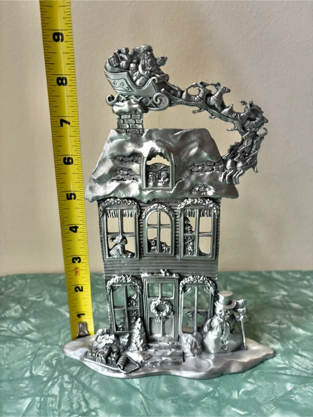 94This is a beautiful 1996 Sengali Canada Pewter Style Zinc Christmas House. It is in great condition and would be a wonderful addition to your holiday decor! It measures approximately 9 inches tall.