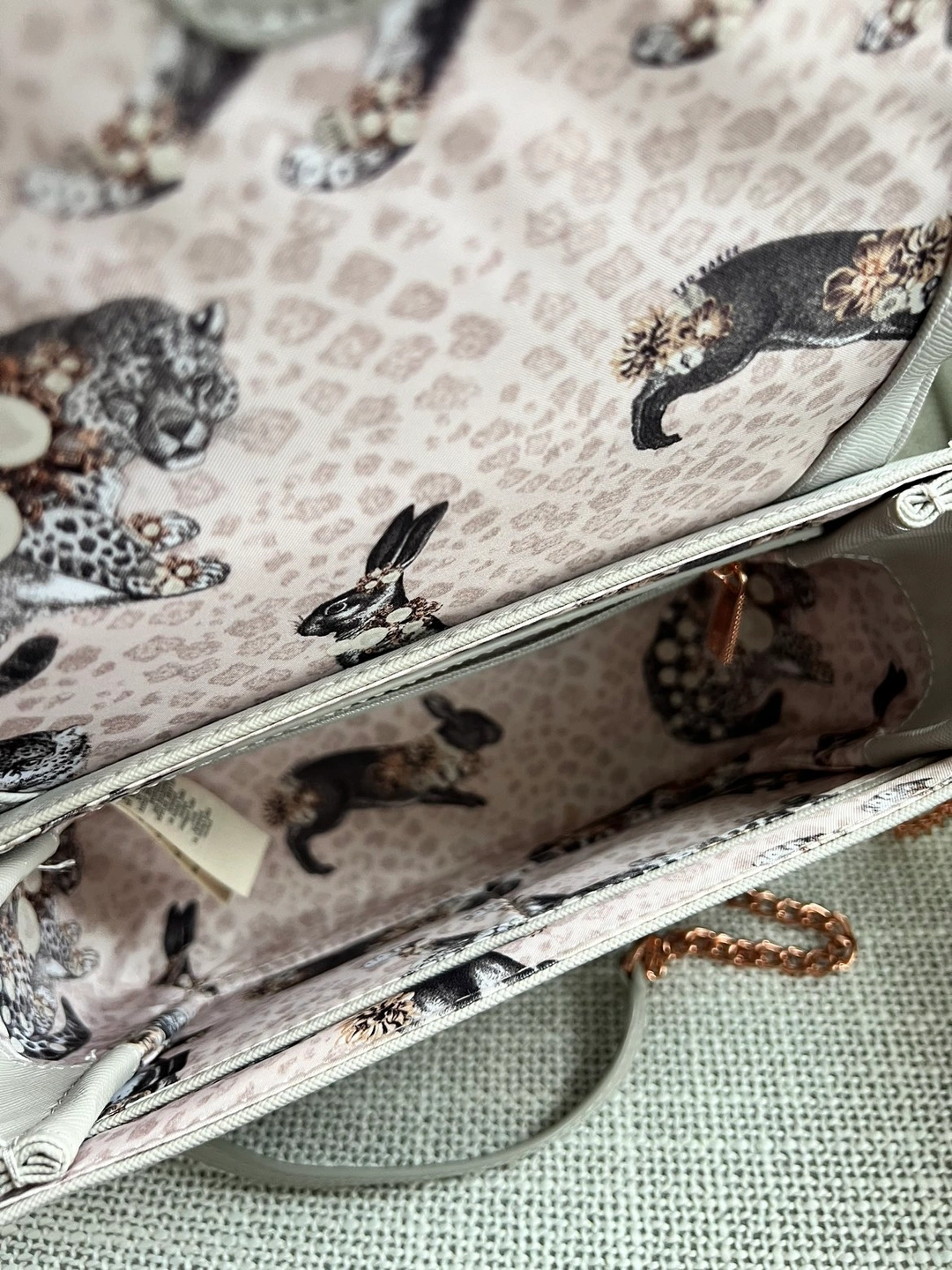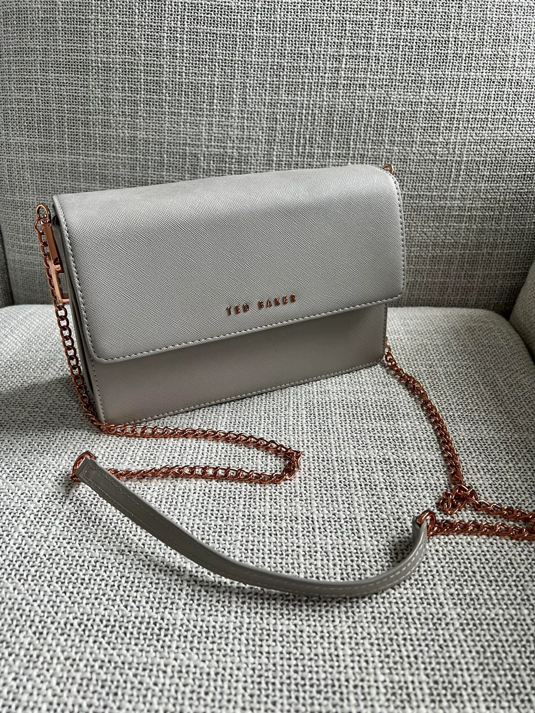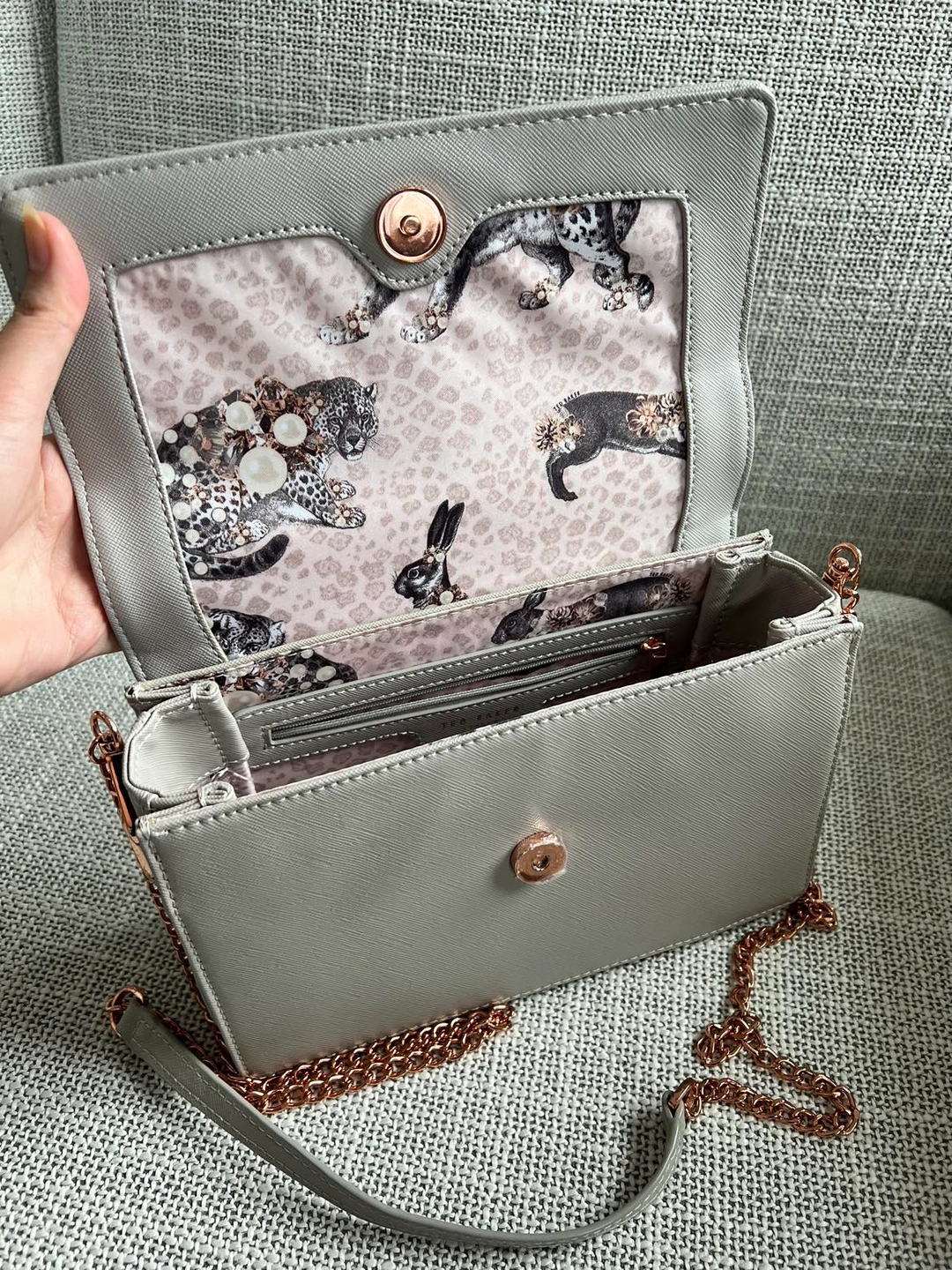 Beautiful Ted Baker grey bag with an animal pattern interior and rose gold chain. No damage, but the bottom of the bag has a slight dent from storage (second last photo).