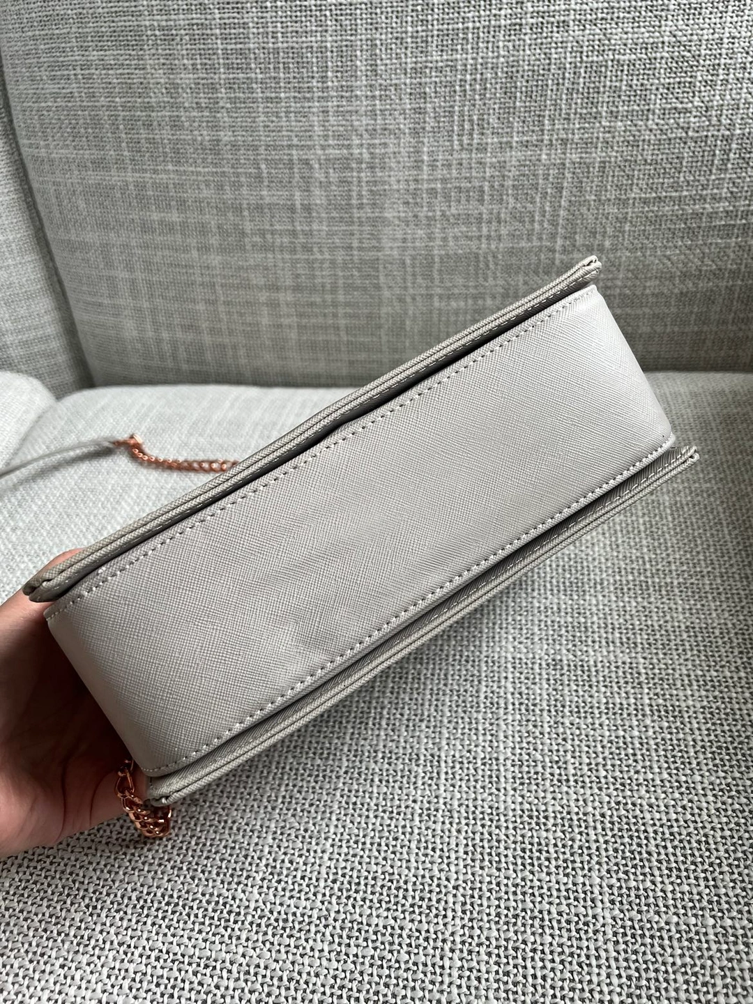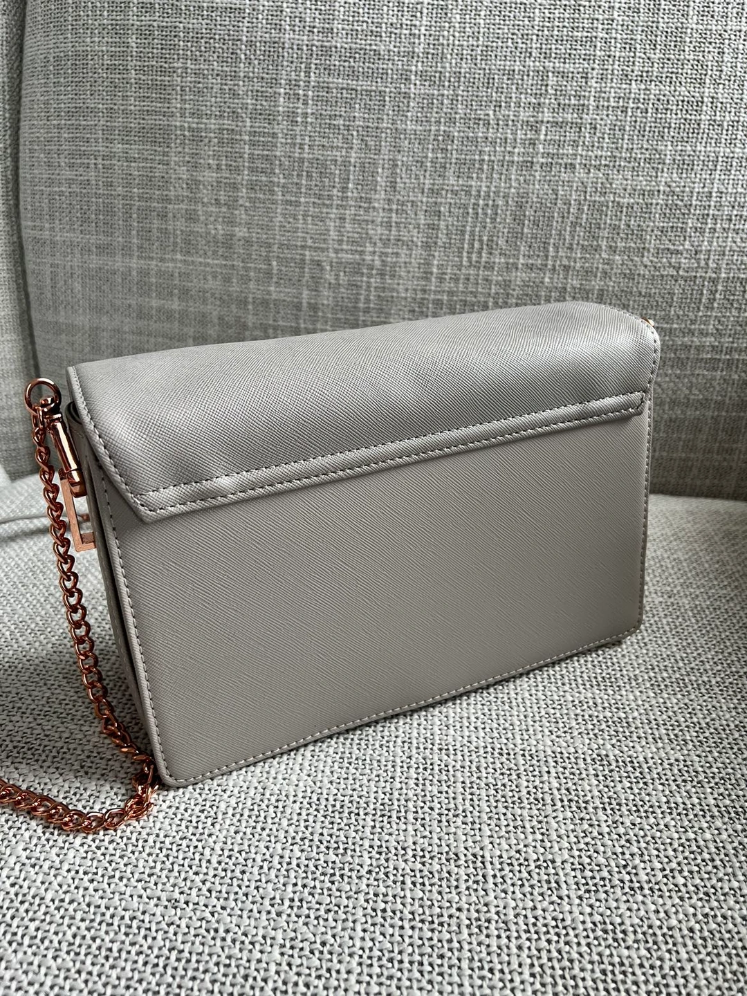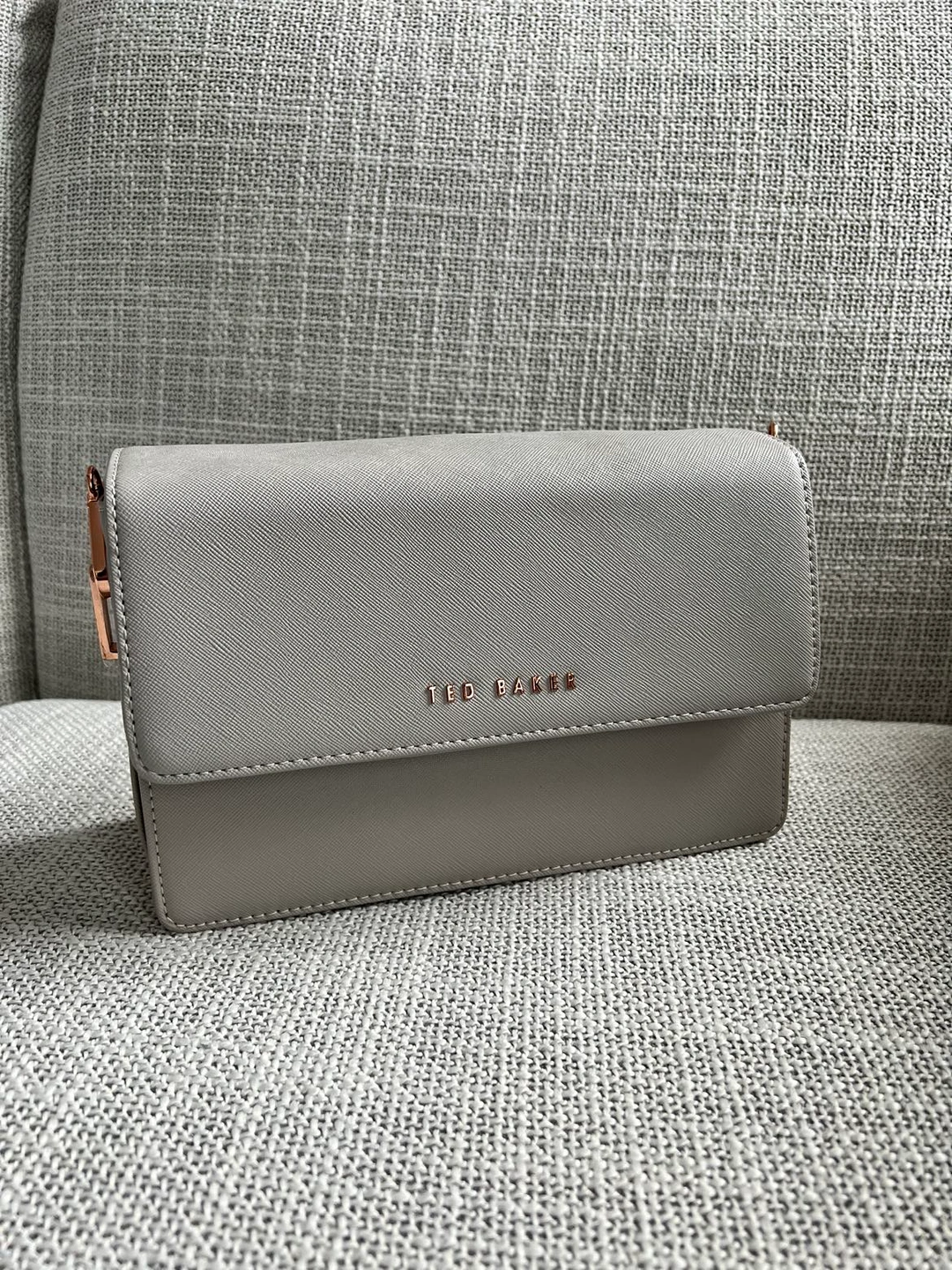 Beautiful Ted Baker grey bag with an animal pattern interior and rose gold chain. No damage, but the bottom of the bag has a slight dent from storage (second last photo).