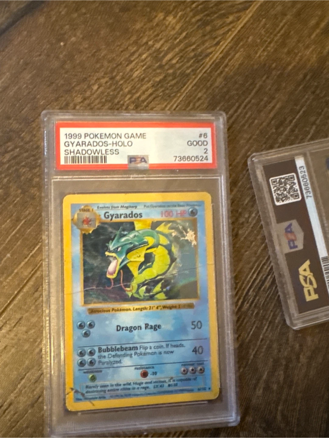 10Selling a 1999 Pokemon Game Gyarados-Holo Shadowless card. It's graded as 'Good' and comes in a protective case. A cool collectible for any Pokemon fan