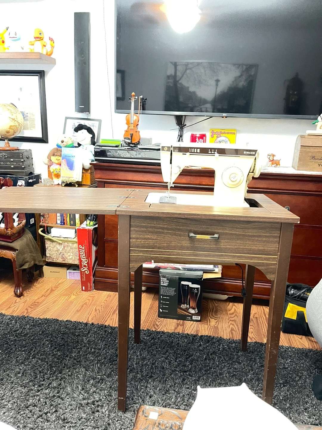 This is a vintage Singer sewing machine with its original cabinet. It's a cream-coloured model, likely from the mid-20th century. The cabinet has a dark wood finish and a fold-out extension leaf. It comes with a drawer for storage. A great piece for any crafter!