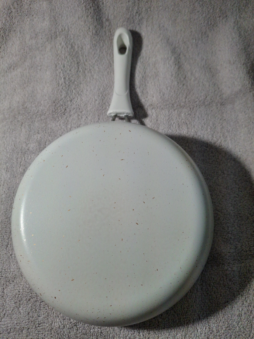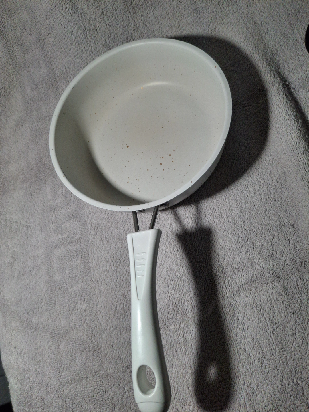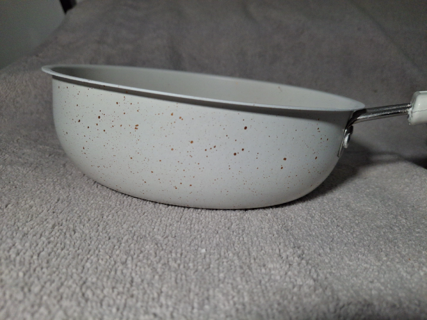1000+Selling a speckled white frying pan! it is new and ready for your next culinary adventure. It has a metal handle with a white plastic grip. 19cm diameter 15cm handle