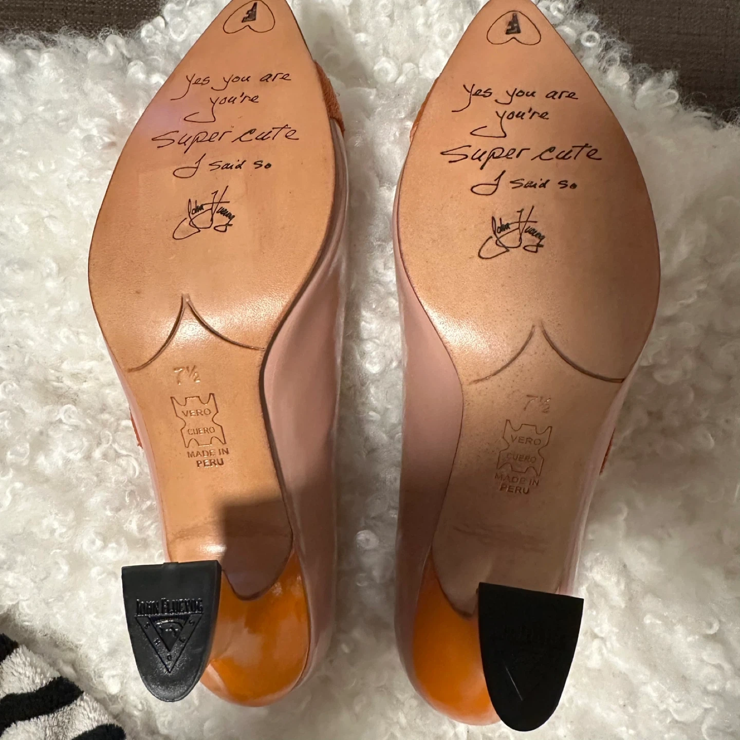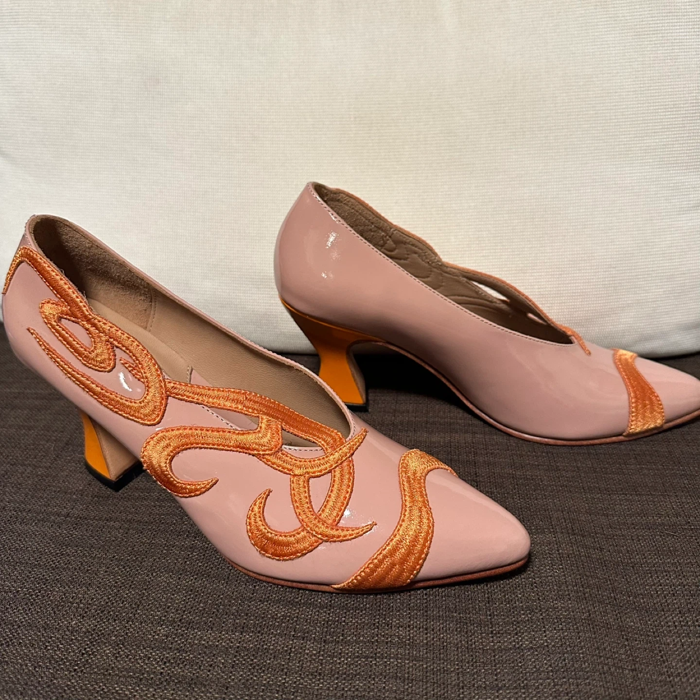 Size 7.5 These are a pair of John Fluevog Hotchkiss embroidered pumps. They feature a unique design with orange embroidery and a distinctive heel shape. They are new, never worn.