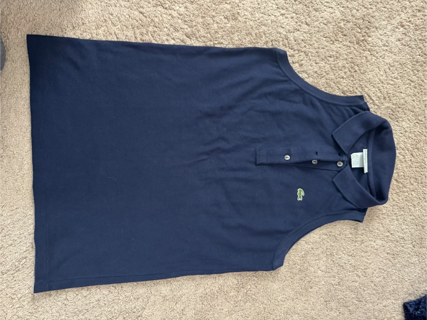 Navy blue Lacoste sleeveless polo shirt. Made in France from 100% cotton. Features a two-button placket and the signature crocodile logo.
