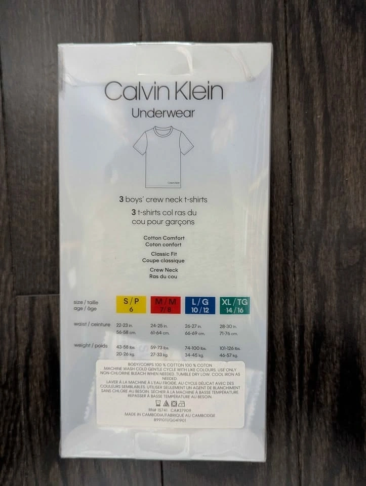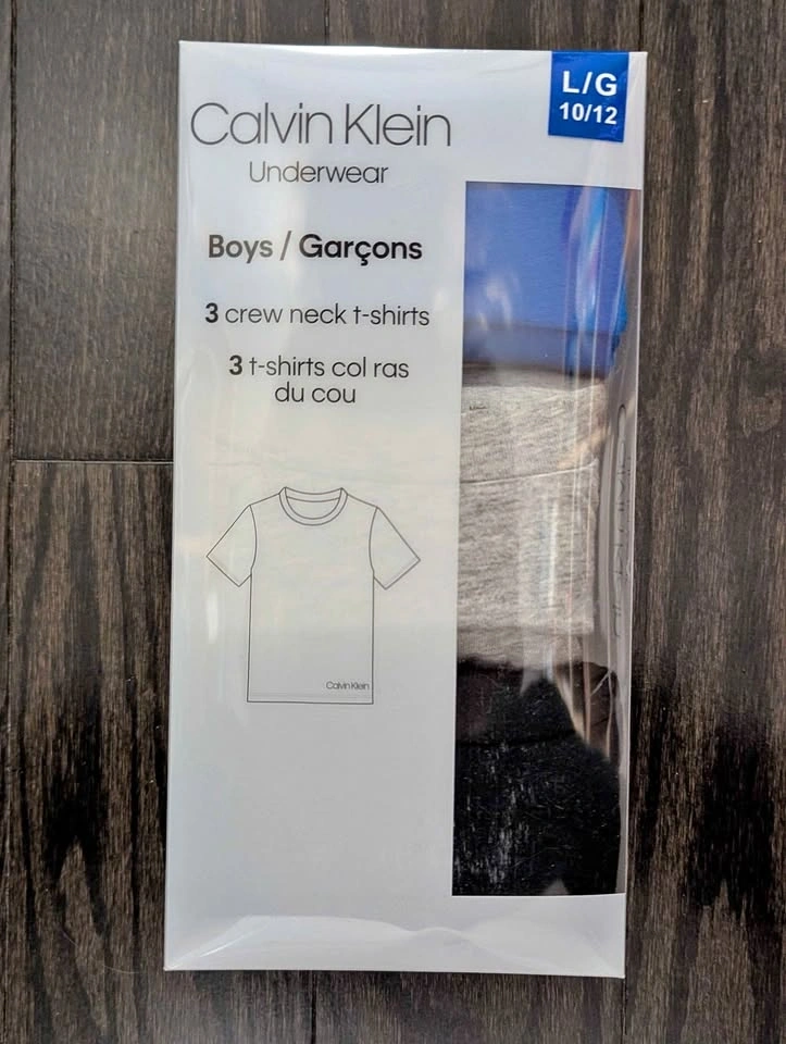 New Calvin Klein boys undershirts. This pack includes 3 crew neck t-shirts in size L (10/12). Made from 100% cotton. Colors are blue, grey, and black.