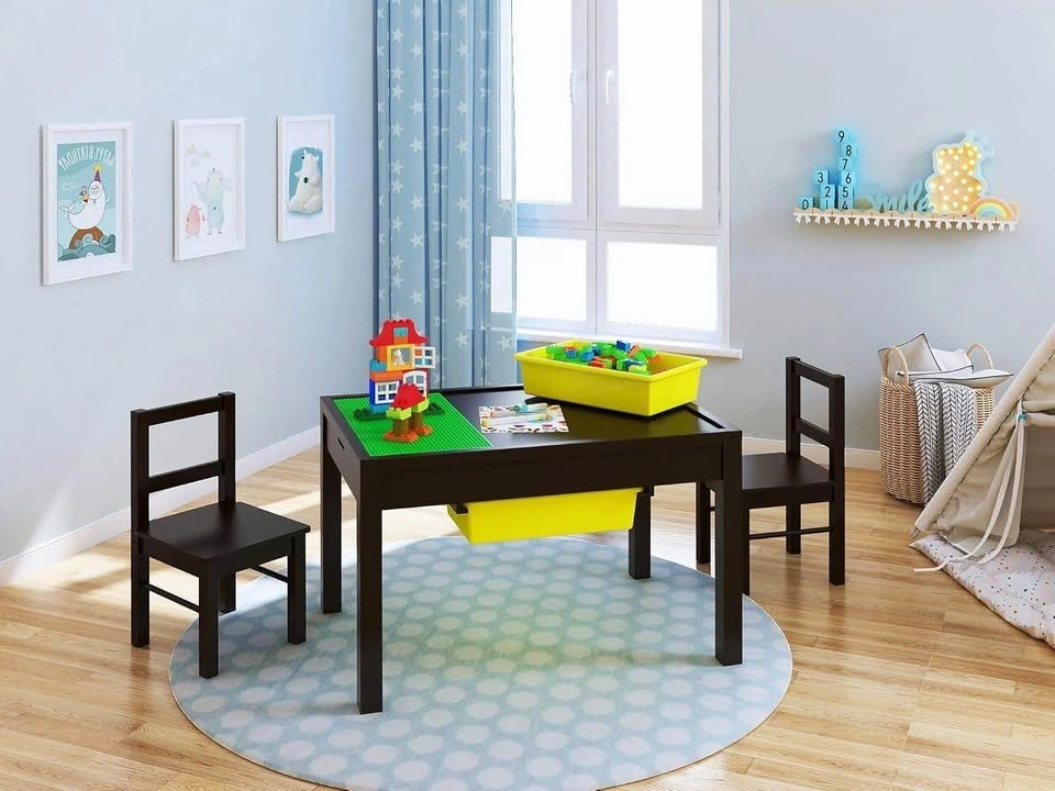 This table with storage is sized right for toddlers and kids aged 3+. It features a double-sided play surface: one side is compatible with building blocks for creating fun structures, and the other side is a smooth surface perfect for train sets, puzzles, dollhouses, and other toys. It includes a built-in storage compartment and two large removable bins that slide underneath, helping to keep rooms tidy. The construction panels on top are compatible with most major building bricks. This wooden kids table is a perfect gift for boys and girls. It's sturdy, durable, and easy to clean. Matches our kids chairs (sold separately) for additional seating.