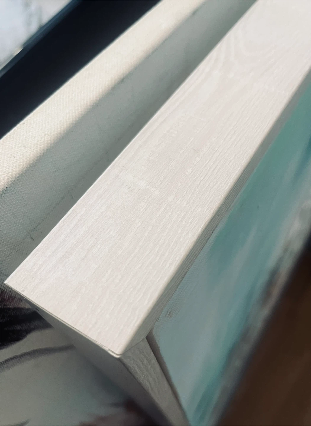 This is a real original painting by local artist, signed on the back of the canvas. Framed in a modern white floater frame.
