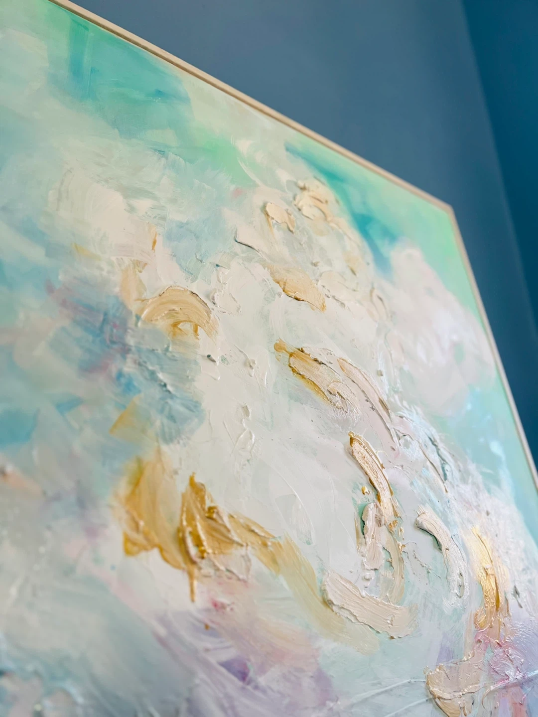 Large abstract painting featuring soft pastel colours. Textured impasto technique used for clouds and water.