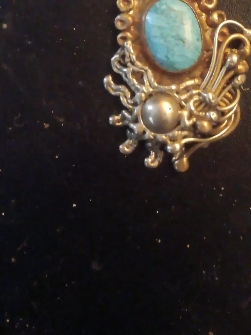 Features a central turquoise stone surrounded by ornate silver-tone metalwork with a pearl accent. This unique brooch showcases a detailed, artistic design. It's a beautiful accessory for any outfit!