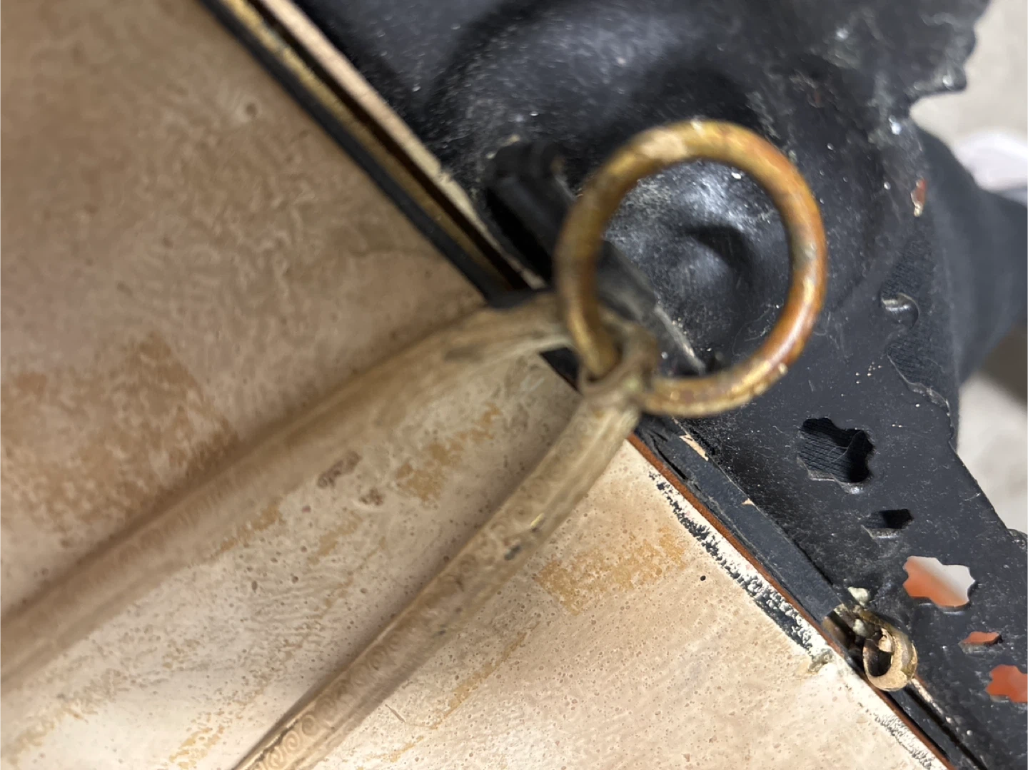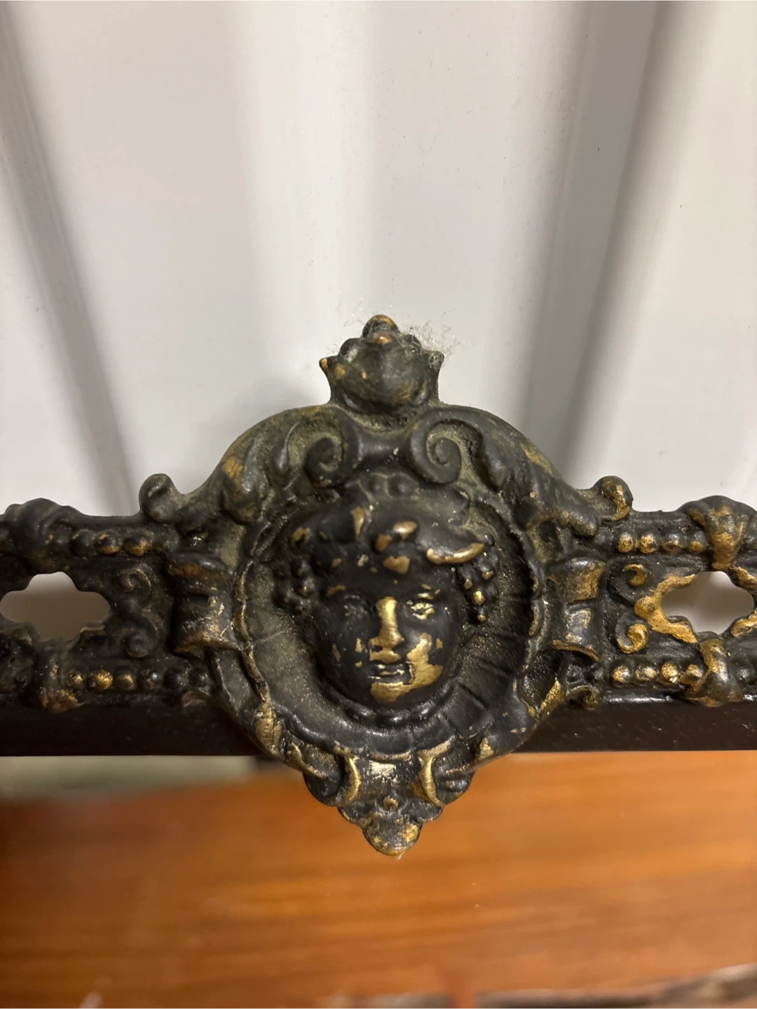 Decorative vanity mirror with an ornate black and solid brass frame. Features intricate detailing and a central Medusa head design. It has an easel back for tabletop or floor display.