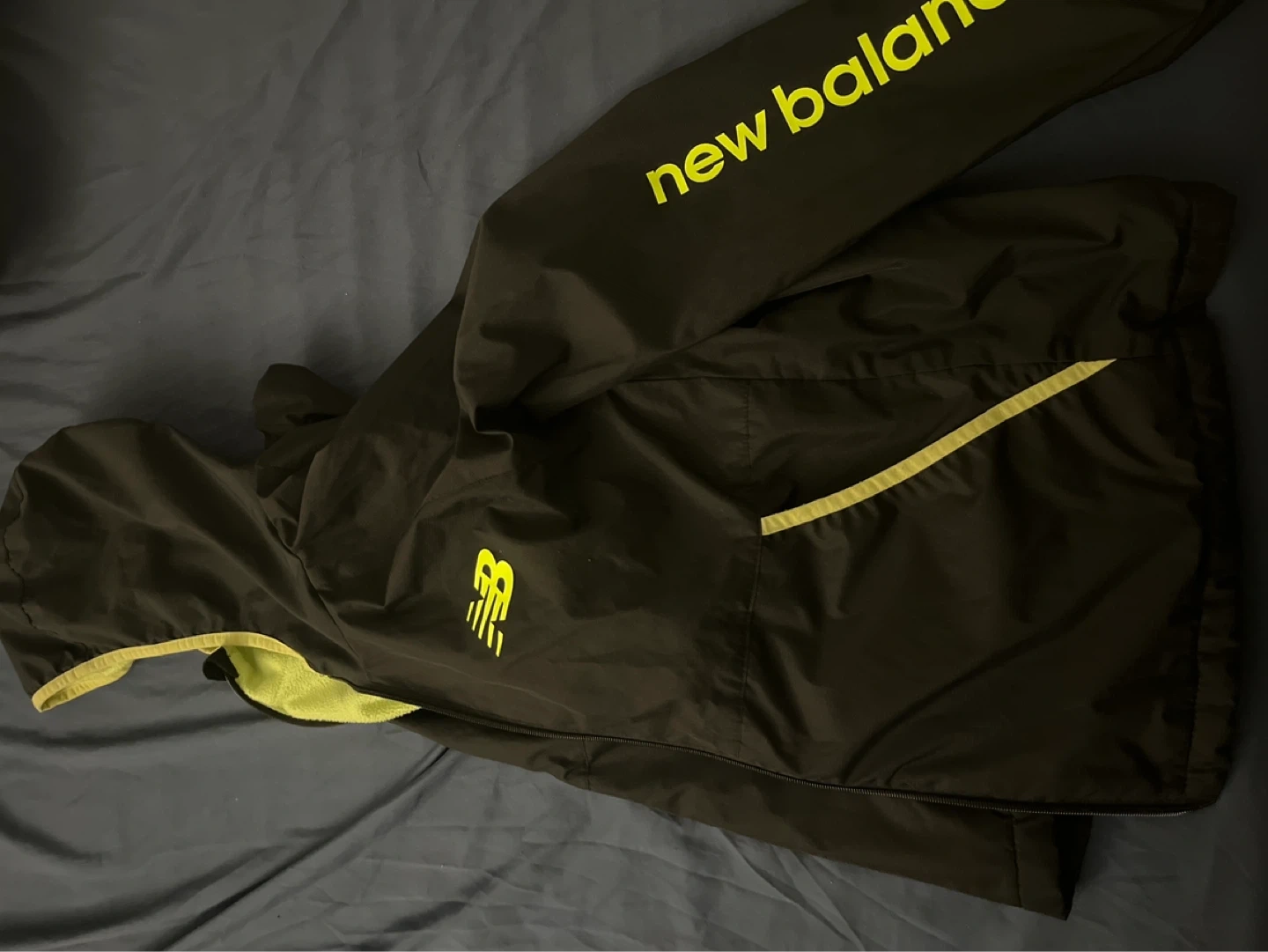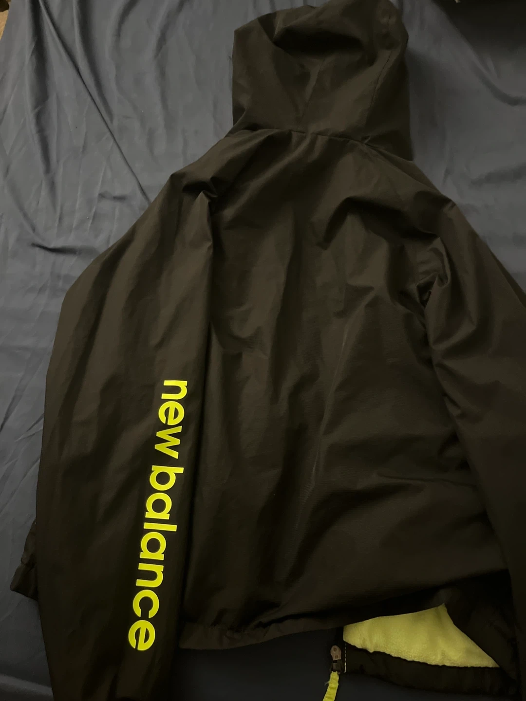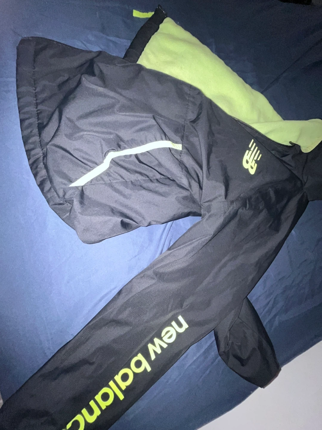 Veste à capuchon New Balance noire avec logo lime sur le devant et le bras. Doublure chaude en molleton lime à l'intérieur. Parfaite pour les activités sportives ou le quotidien.très chaude parfaite pour le sport extérieur dans des températures froides
