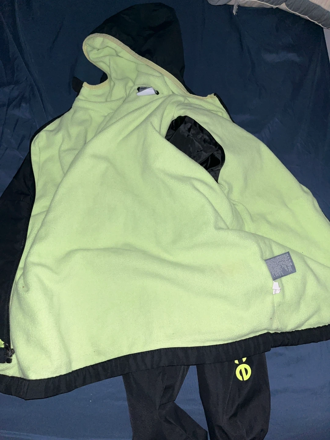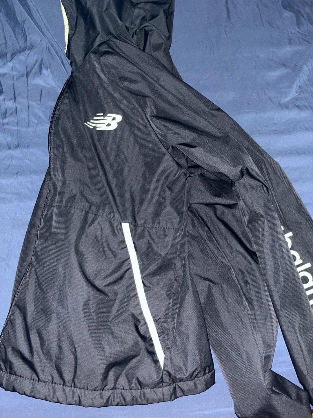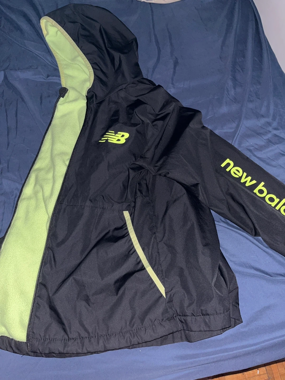 Veste à capuchon New Balance noire avec logo lime sur le devant et le bras. Doublure chaude en molleton lime à l'intérieur. Parfaite pour les activités sportives ou le quotidien.très chaude parfaite pour le sport extérieur dans des températures froides