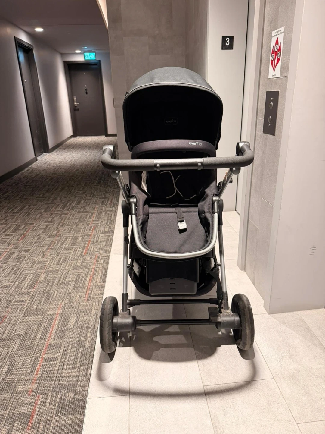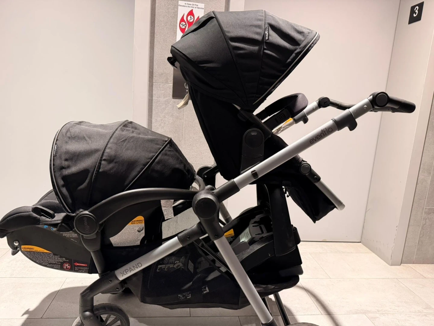 This black Evenflo Xpand travel system includes a stroller and infant car seat. It's designed for easy one-handed folding. Multiple seating options are available for convenience.