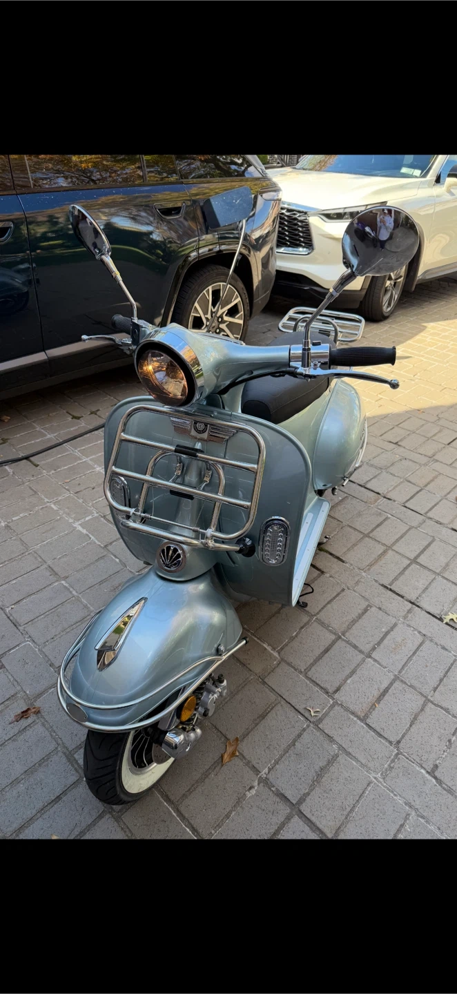 BMS Motorsports Chelsea 150cc scooter in a light blue finish. Features a comfortable black seat with the BMS logo and a rear luggage rack. It's equipped with chrome accents and white-wall tires. This scooter provides a stylish and practical way to get around town!