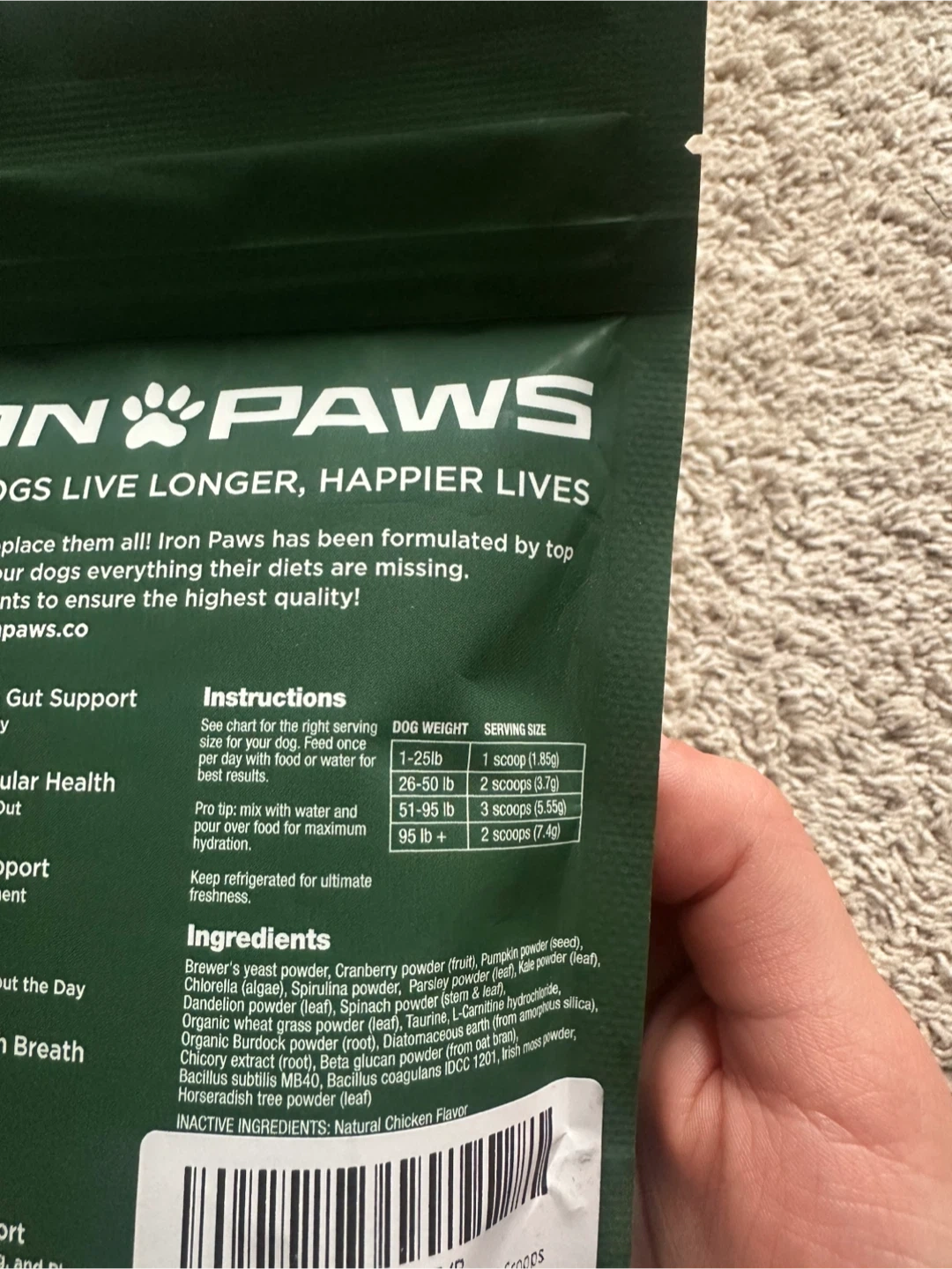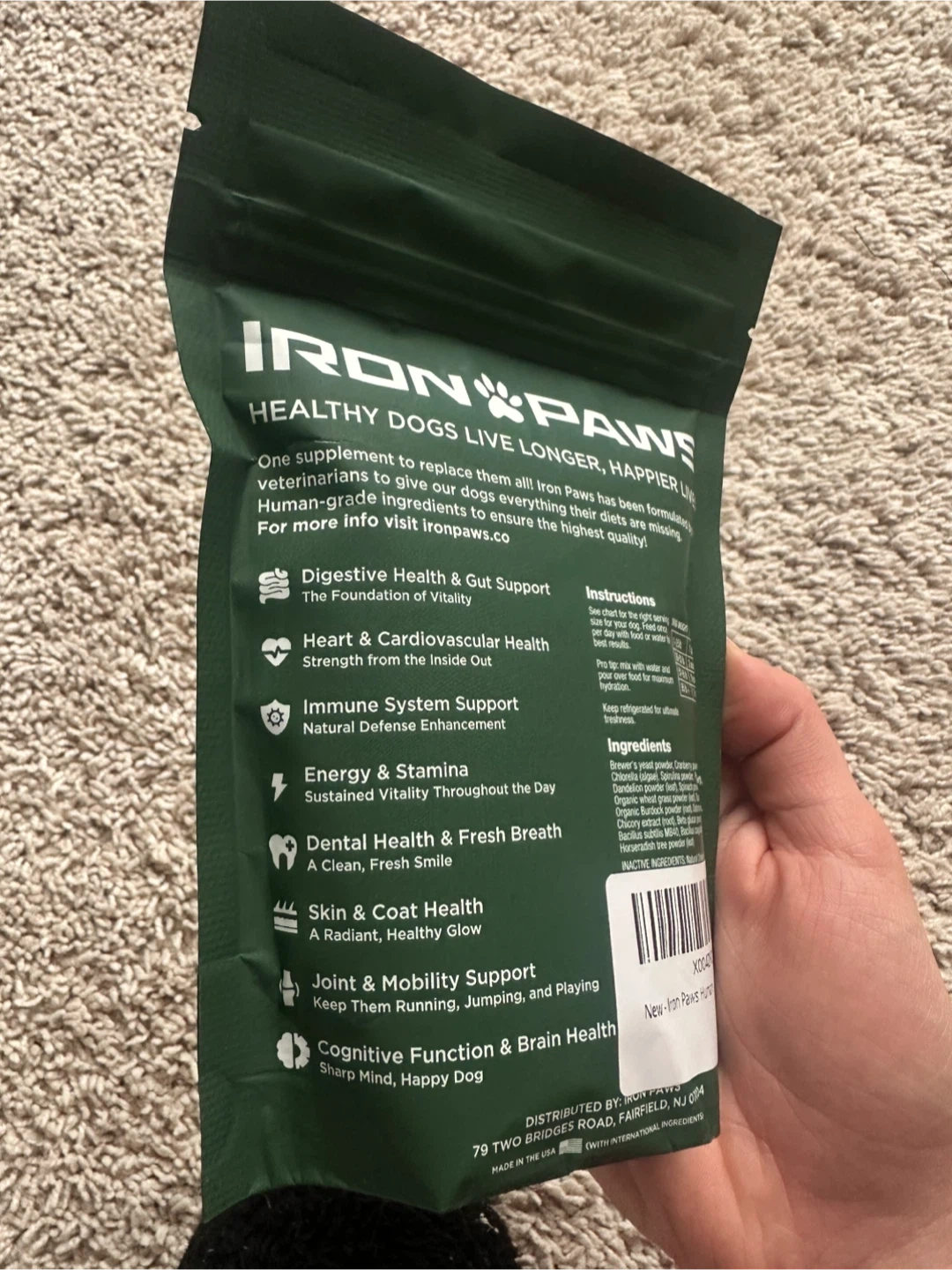 This is Iron Paws human-grade super food supplement for dogs. It's formulated by veterinarians to ensure your dog gets everything their diet is missing. Net wt. 3.5oz (99g). Unopened/brand new