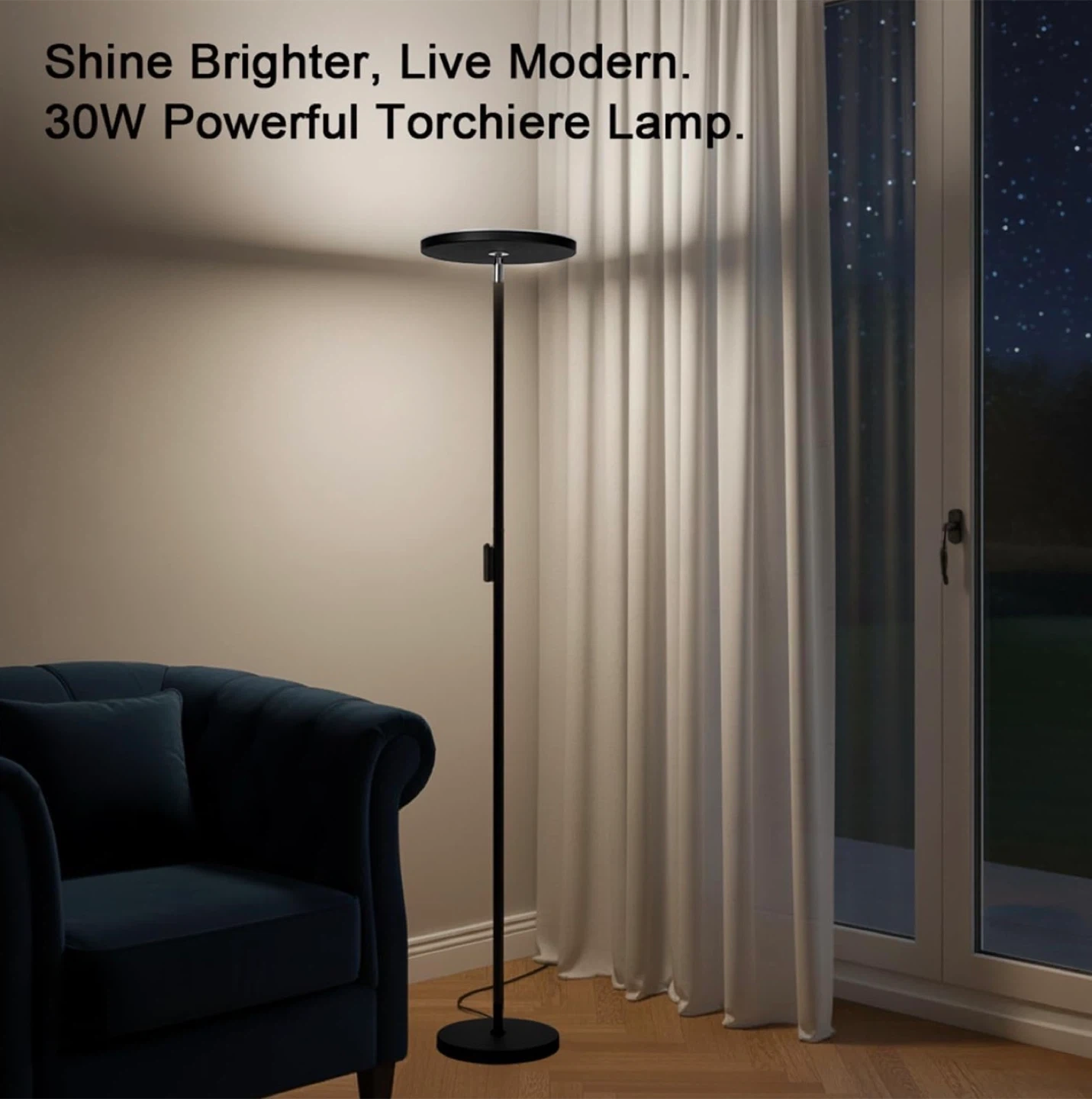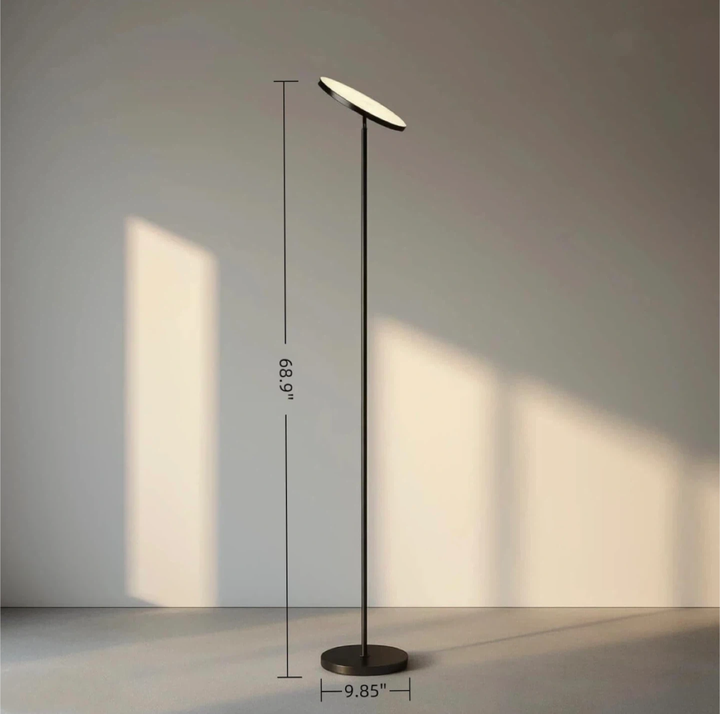 JOOFO Sky LED Torchiere Floor Lamp. It's 68.9 inches tall with a 9.85 inch base. Features dimming range from 5%-100%, 2400lm luminous flux, and 30W power. Includes a remote for operation.