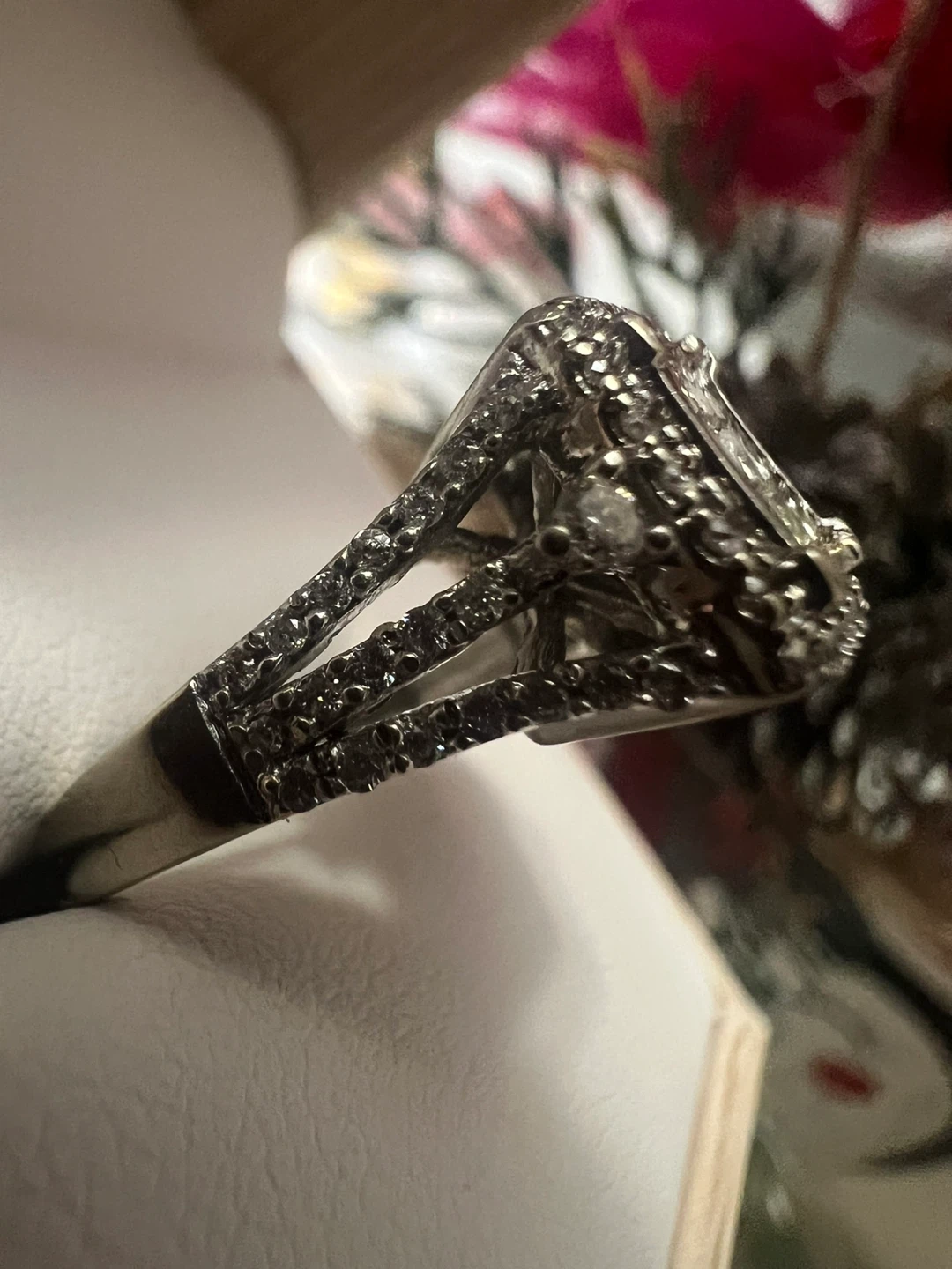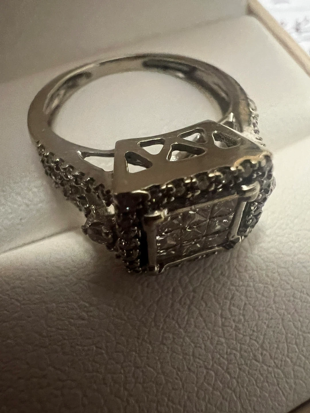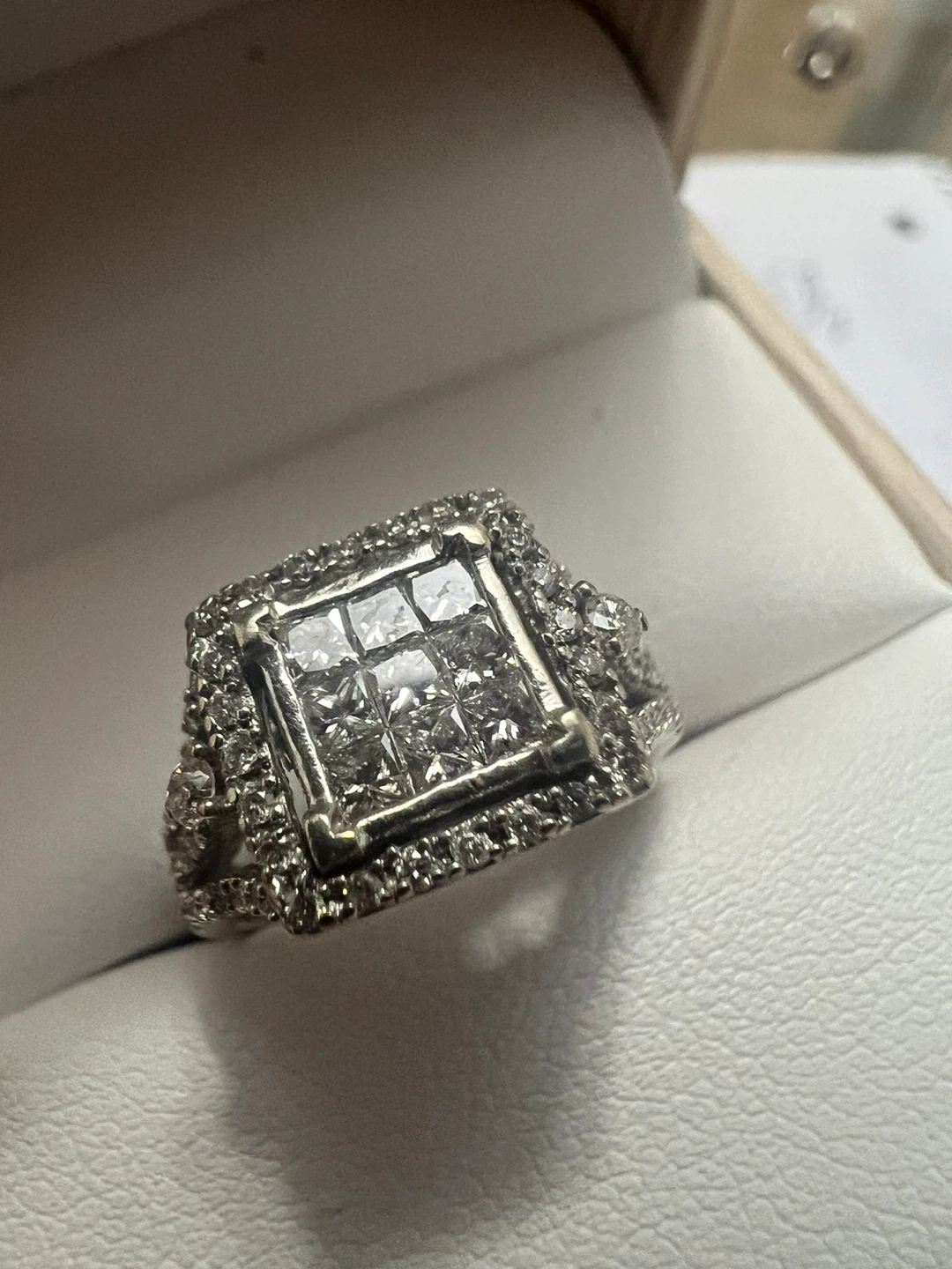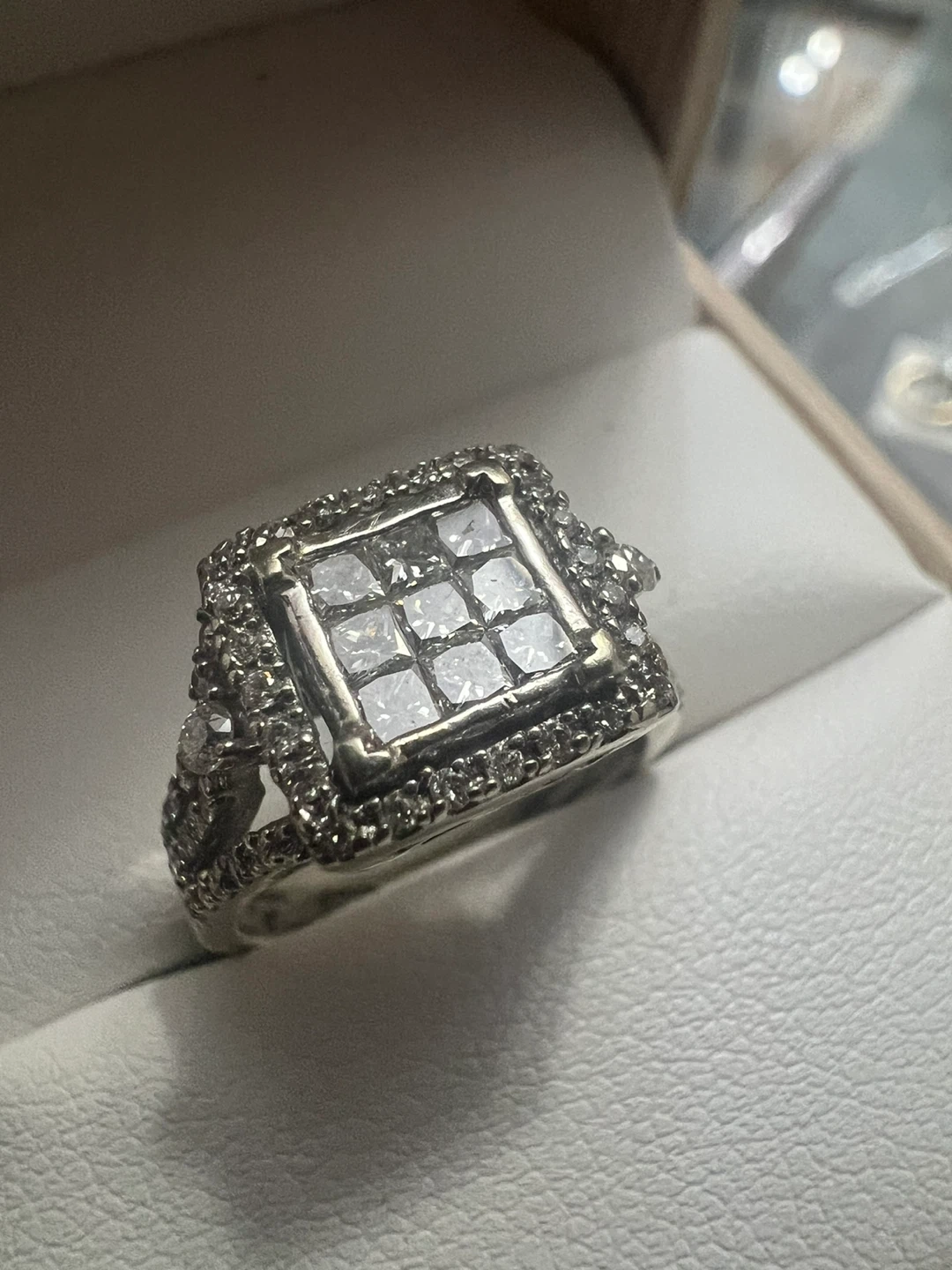 Selling a beautiful 10 k white gold princess cut diamond ring. It's in great condition and comes in a box! The ring is silver in colour.