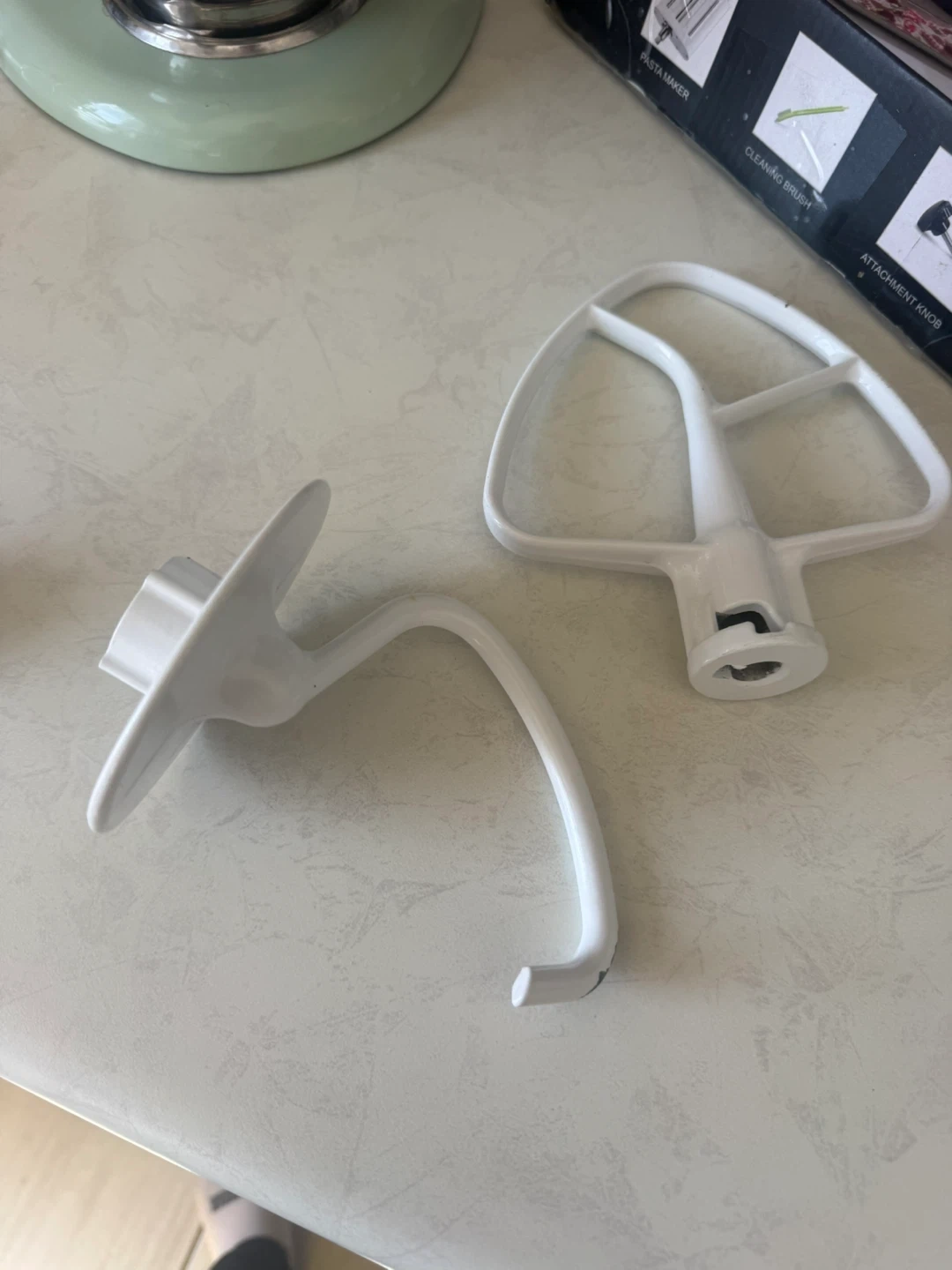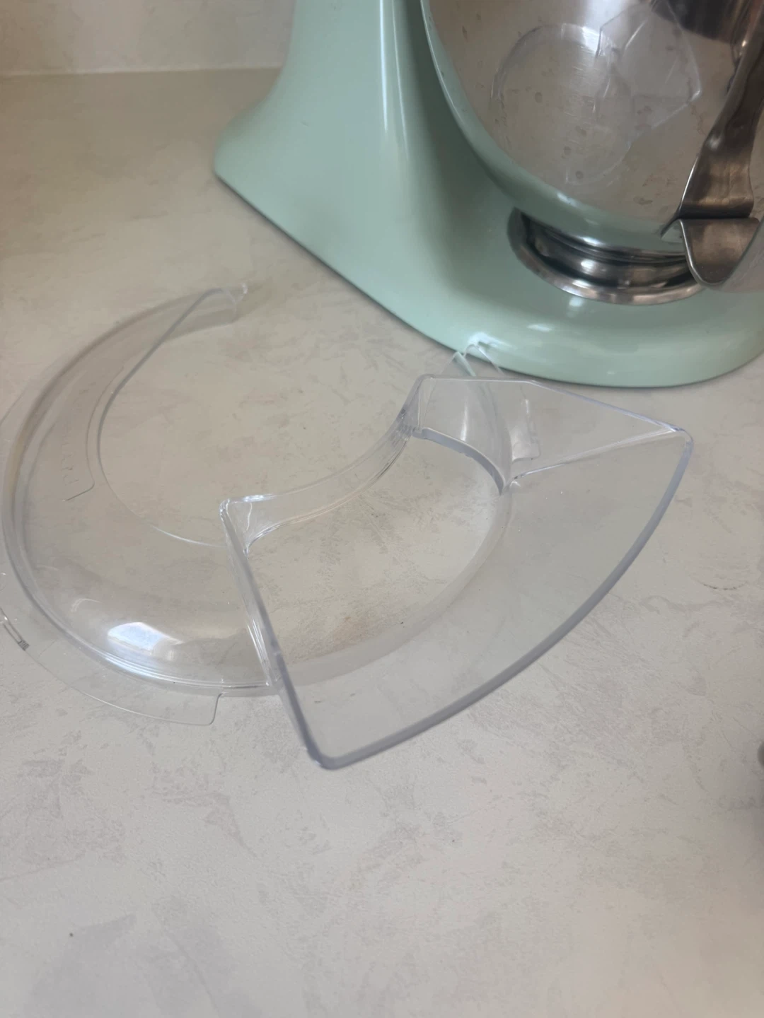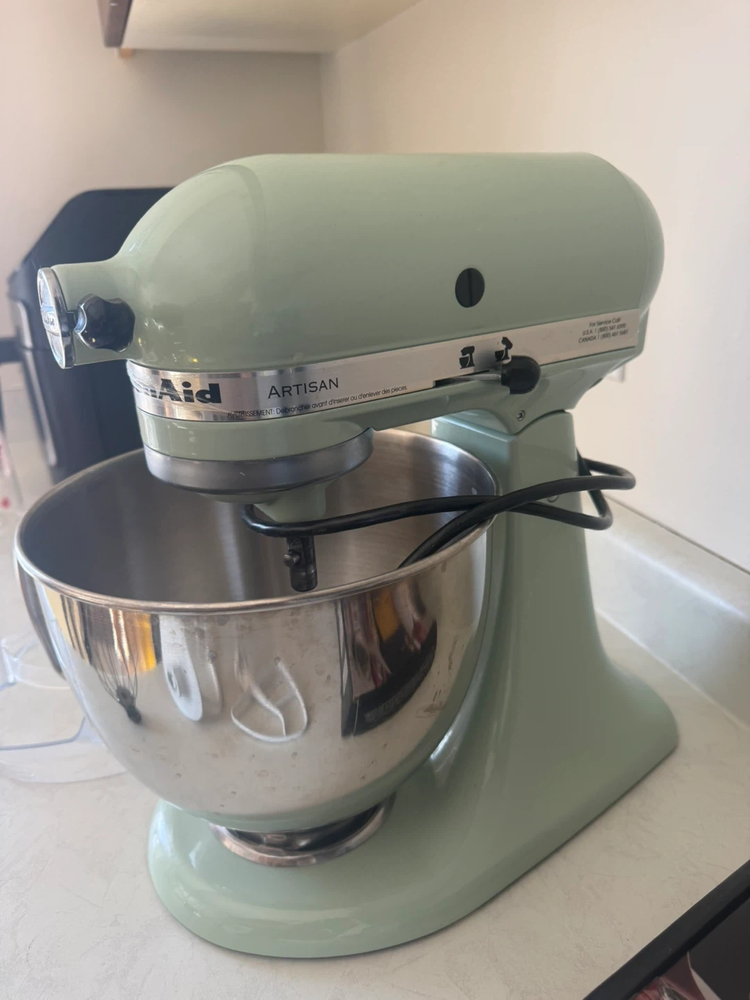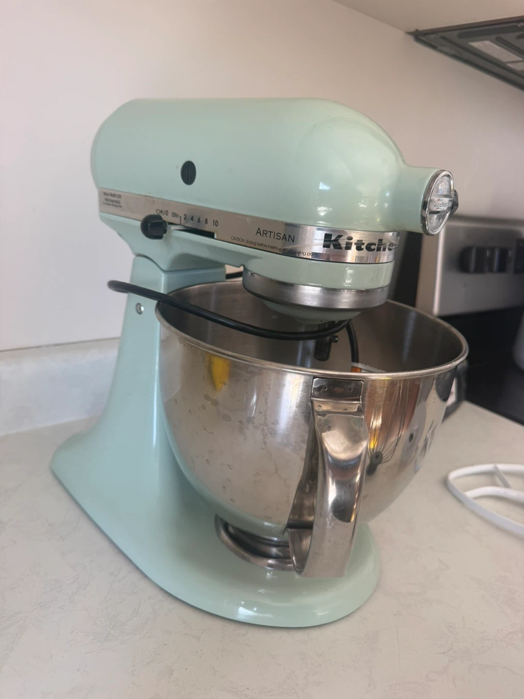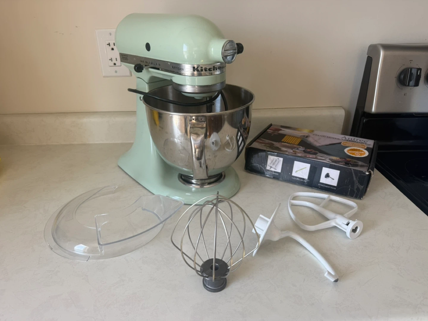 Selling a light green KitchenAid Artisan stand mixer. It comes with the stainless steel bowl, whisk, dough hook, flat beater, and splash guard. Includes attachments.