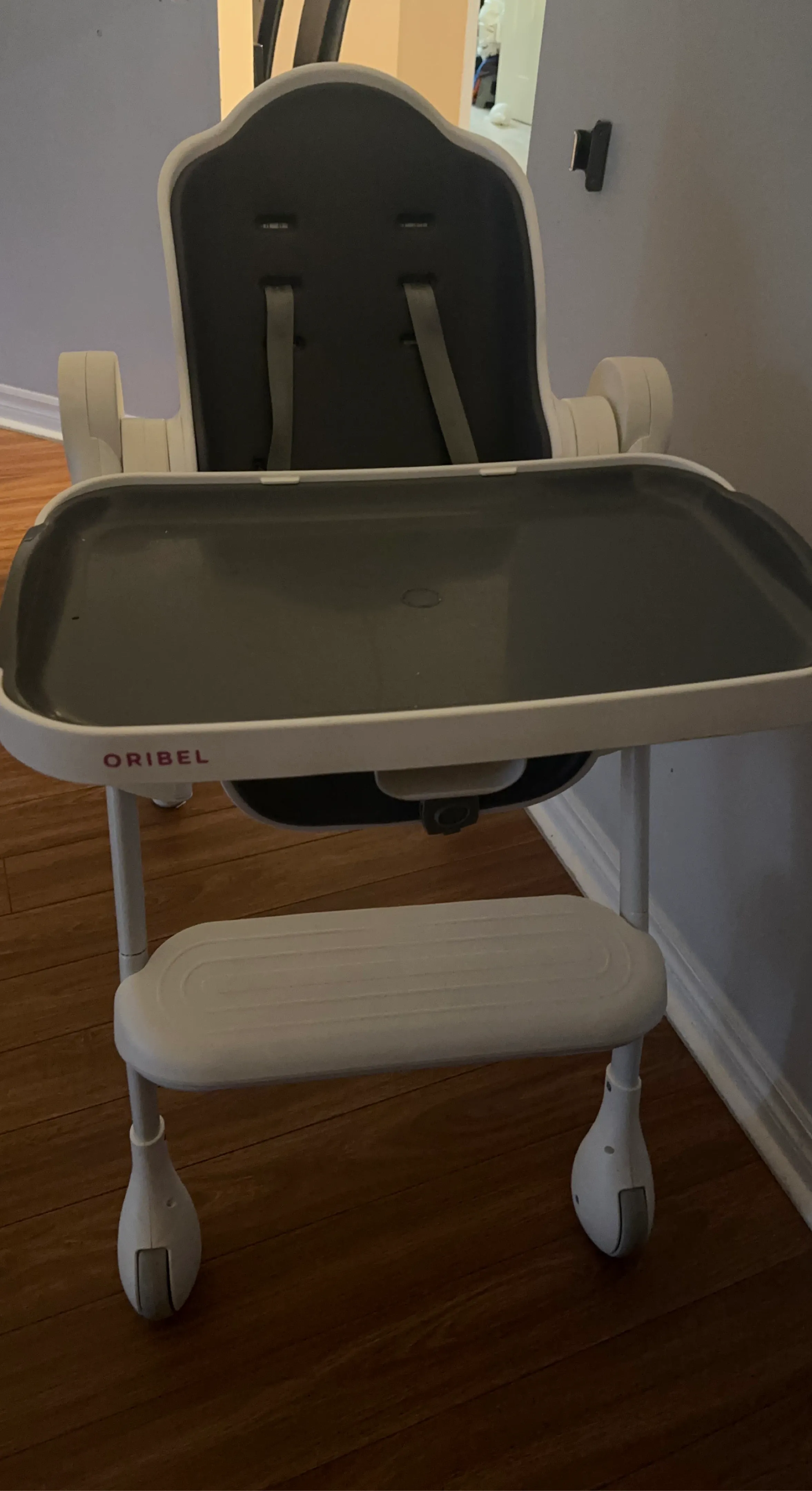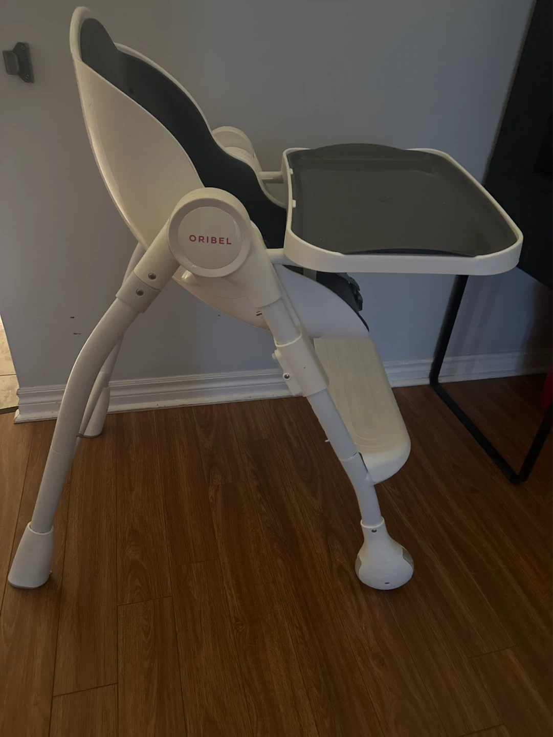 Oribel high chair with a removable tray. It has a white frame and a grey seat insert. Adjustable footrest, height and harness included. Great for meal times!