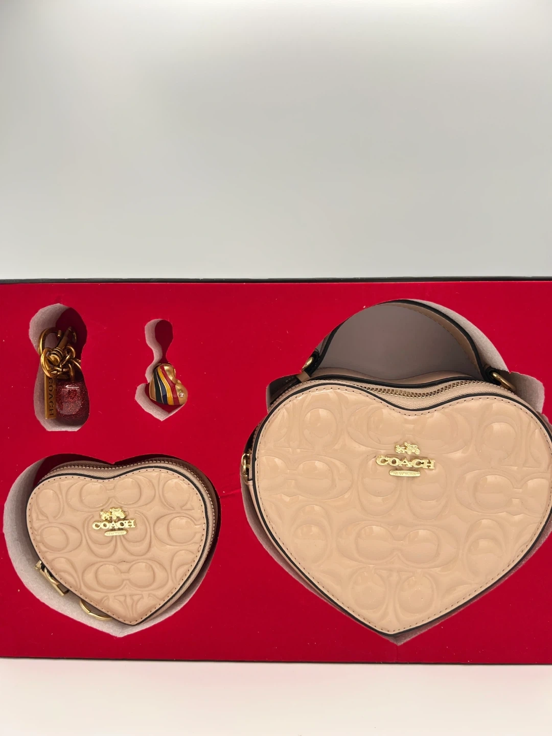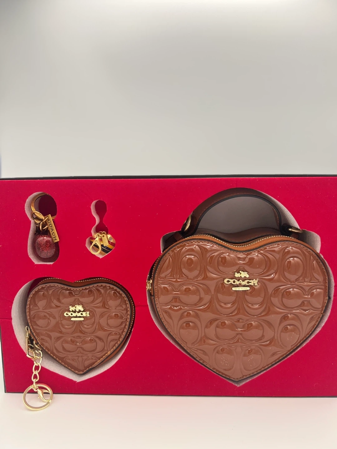 This is a Coach heart-shaped bag and matching coin purse set. It features the signature Coach monogram pattern embossed on patent leather. The set includes the larger heart bag and a smaller heart coin purse with a keychain and bag charms other colors are available.