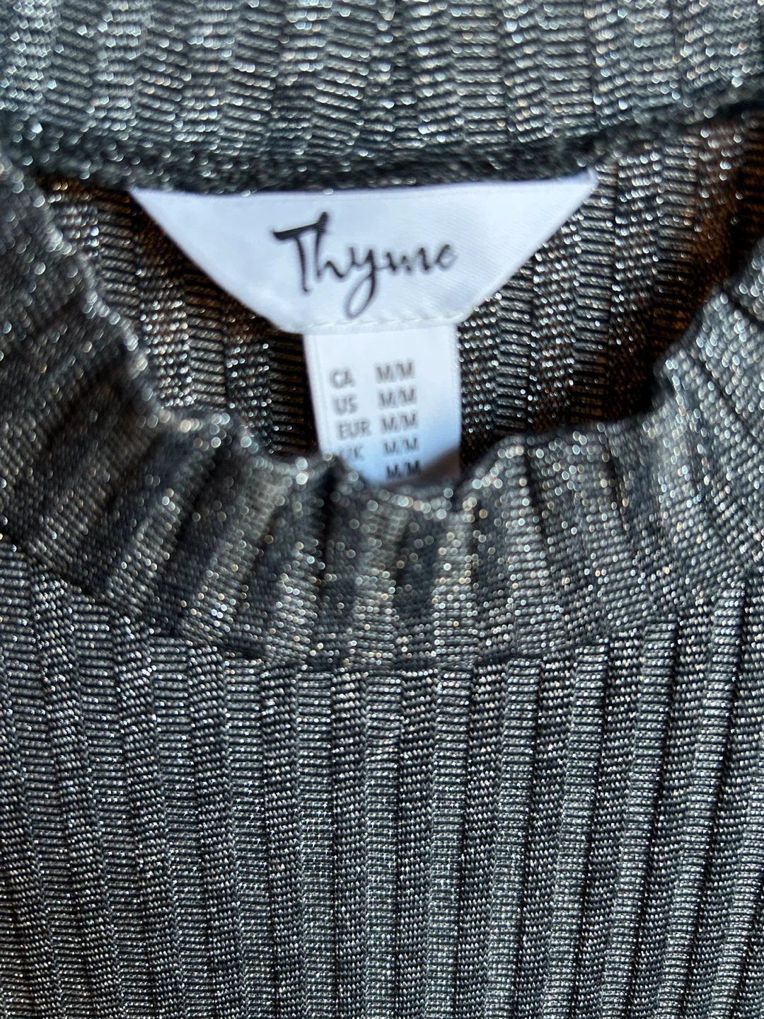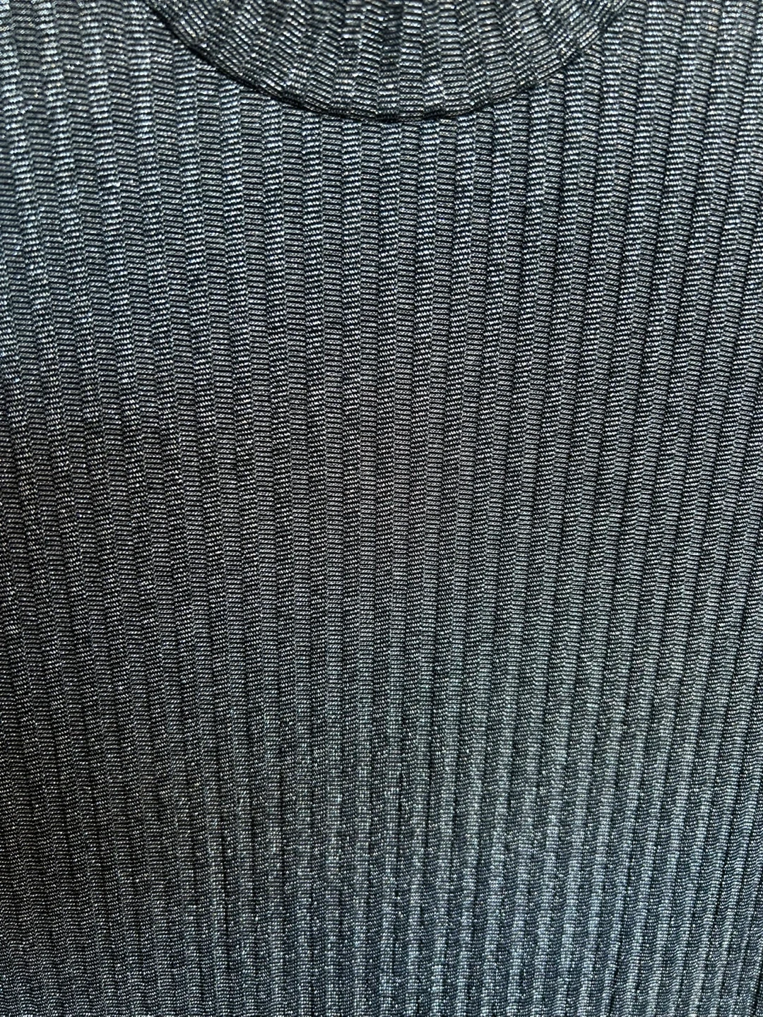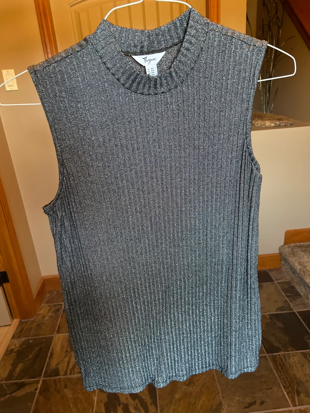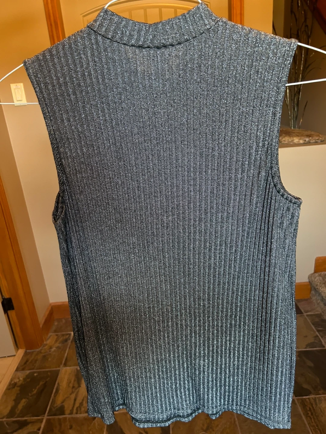 This is a silver and black, ribbed, sleeveless top with a mock neck. It's a size Medium. This top is great for layering or wearing on its own during warmer months.