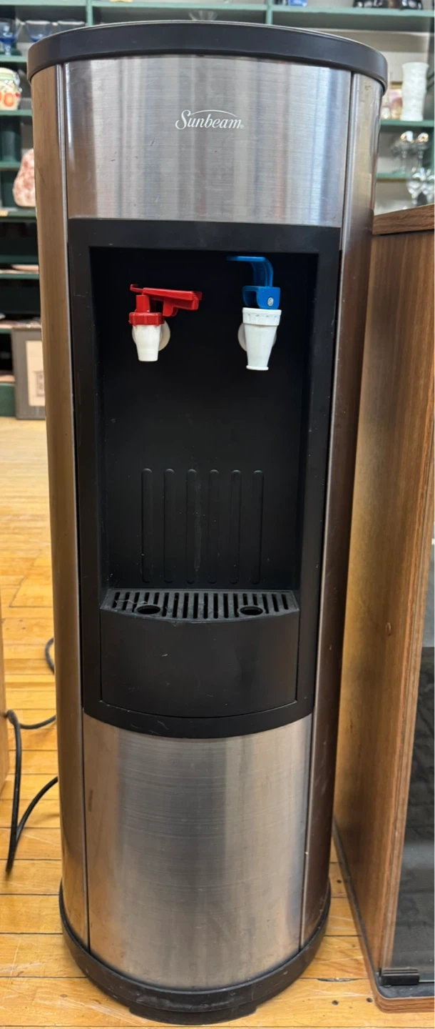 This Sunbeam water cooler dispenser has taps for both hot and cold water. It's made of stainless steel and black plastic. This unit is ideal for offices or homes needing convenient access to chilled and heated water.