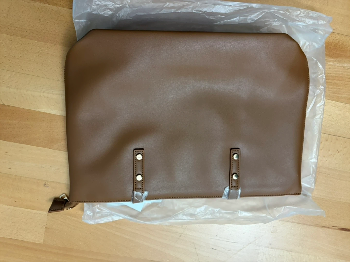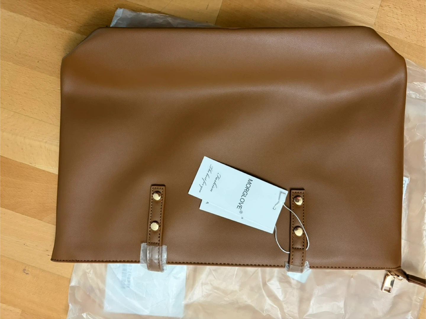 A stylish brown tote bag made from faux leather. It features a zippered closure and a lined interior with pockets. This bag's versatile design makes it suitable for everyday use.
