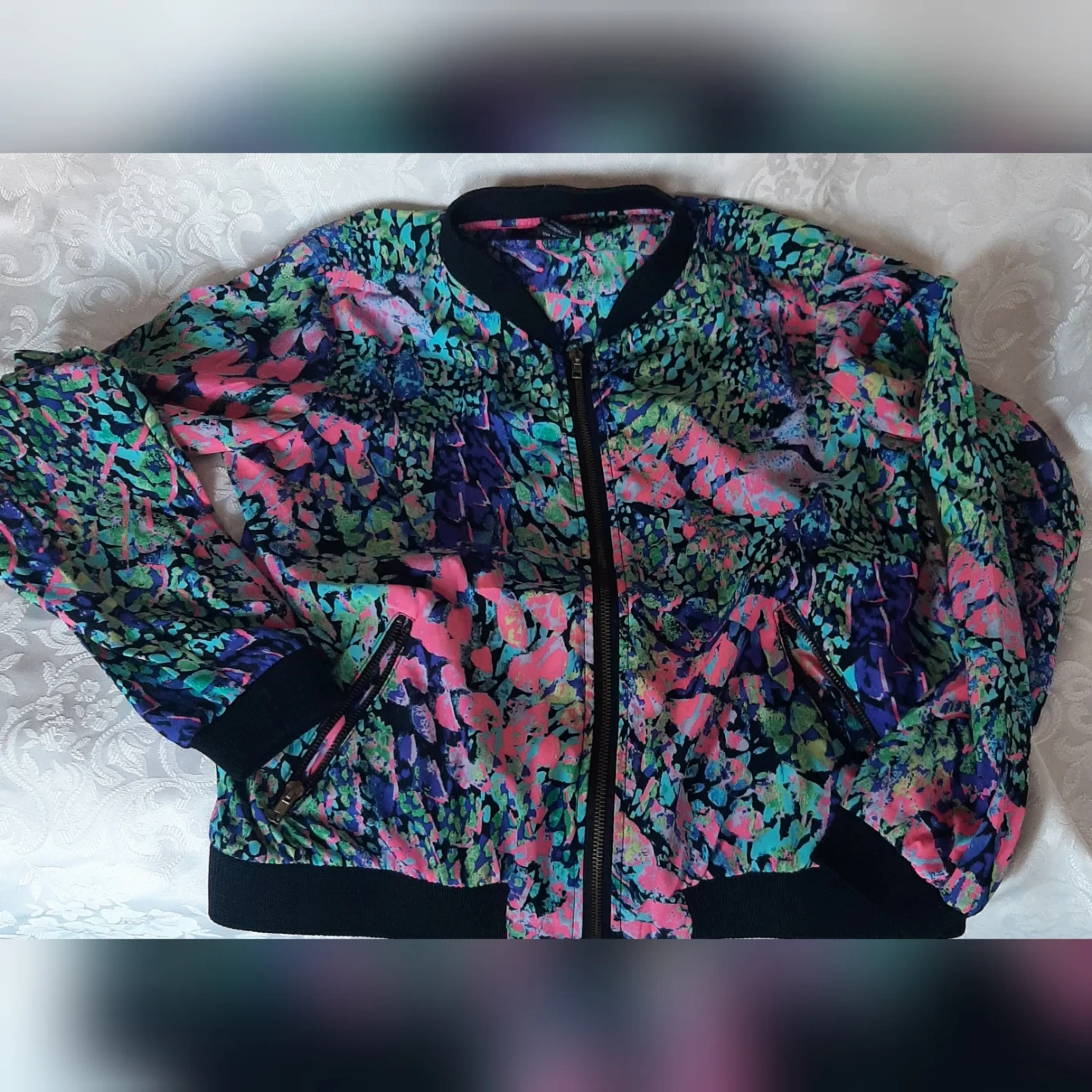 This vibrant bomber jacket features a bold, abstract print. It's designed with a zip-up front and ribbed cuffs and hem. Lightweight and stylish, it's perfect for adding a pop of colour to any outfit!
