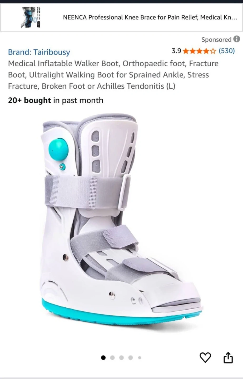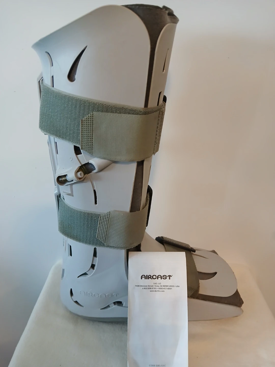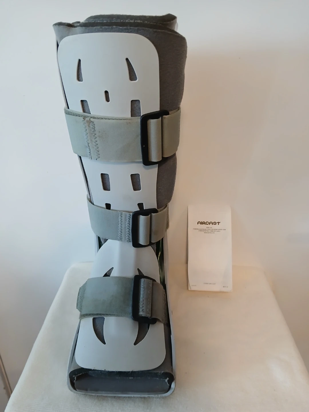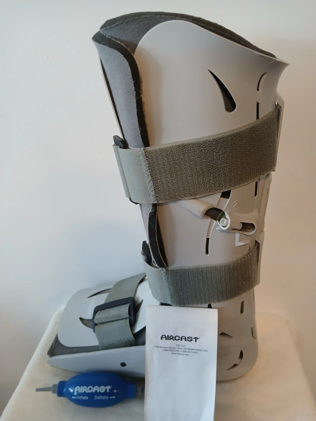 This Aircast walking boot helps with recovery. It comes with adjustable straps for a secure fit. Includes an air pump for inflation.