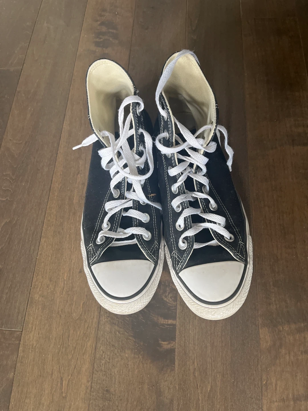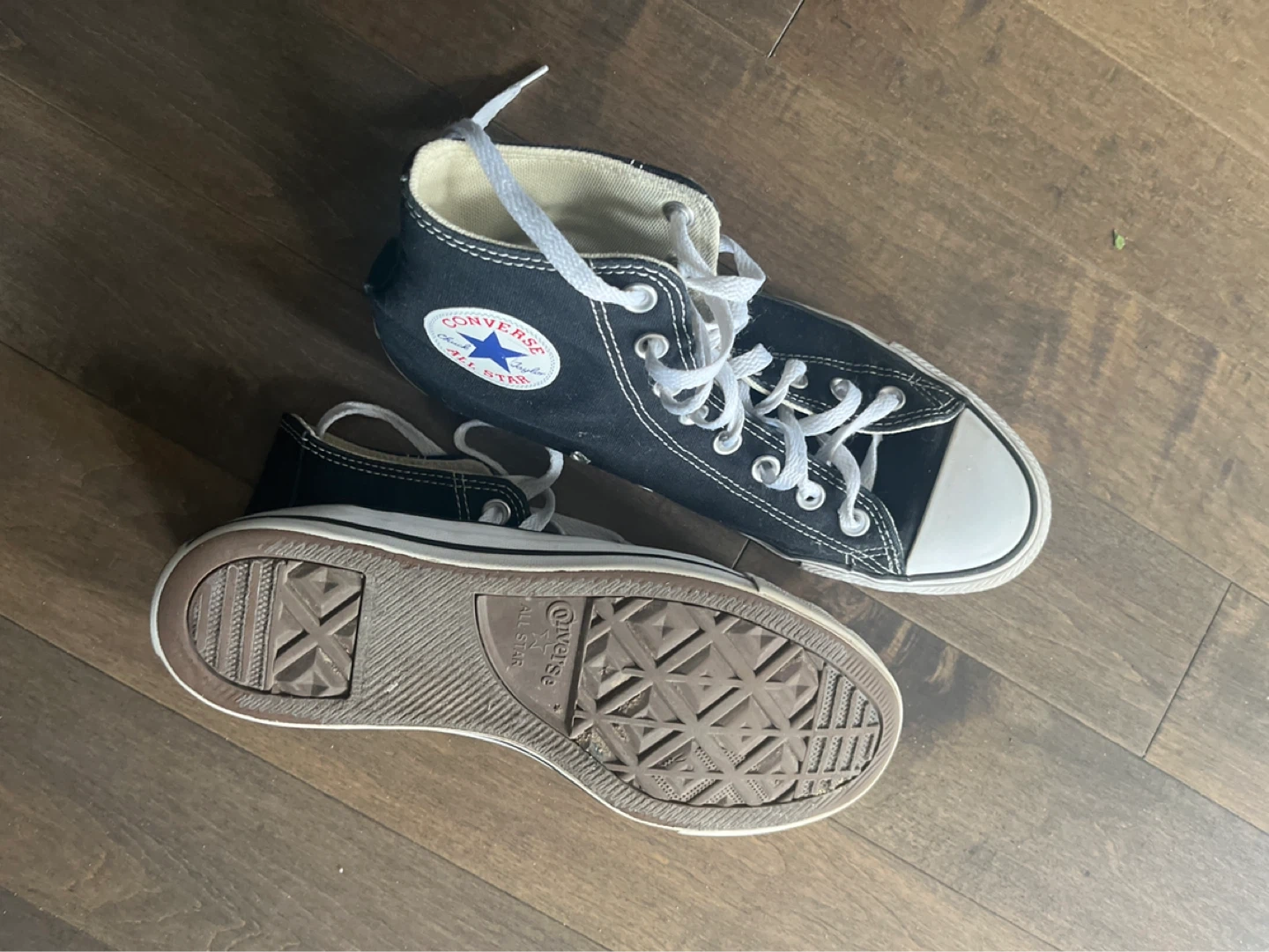 Classic Converse All Star high top sneakers in black canvas. These iconic shoes feature white laces and the signature Chuck Taylor ankle patch. Rubber sole for grip.