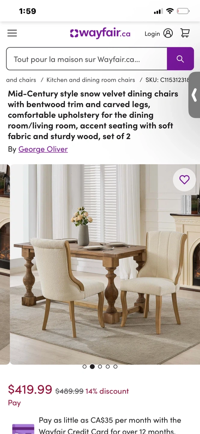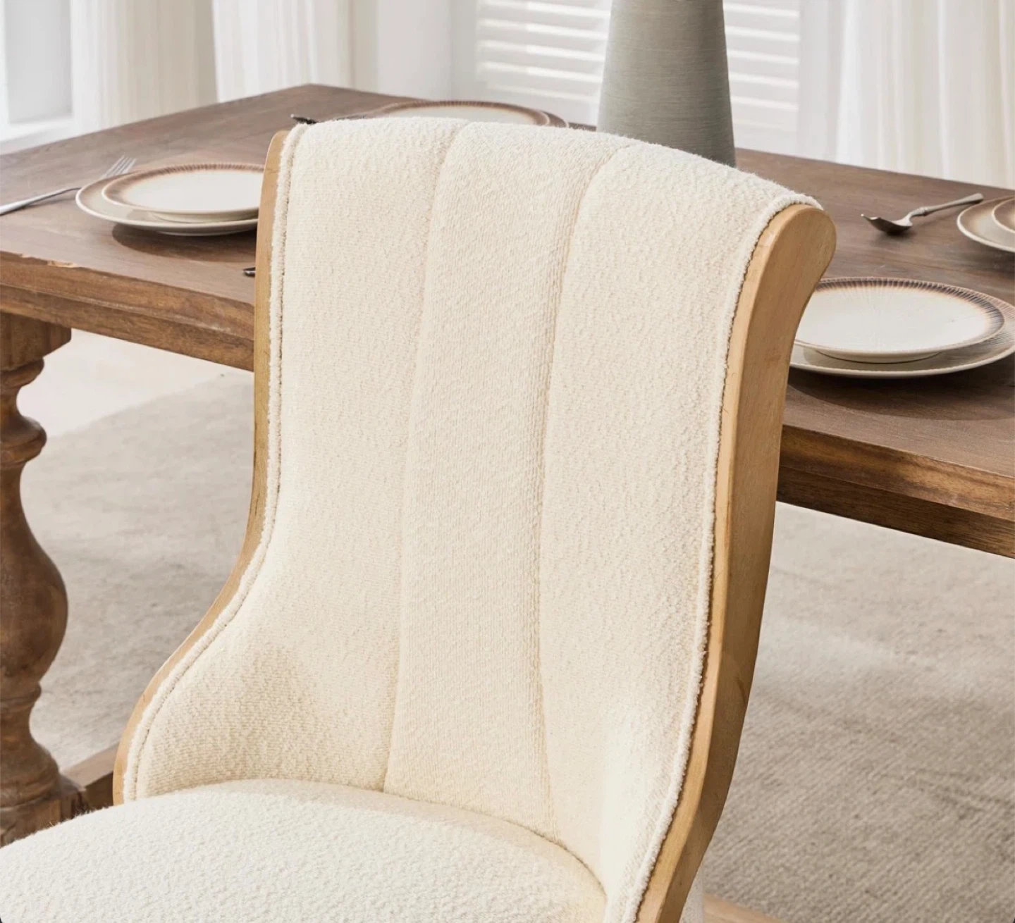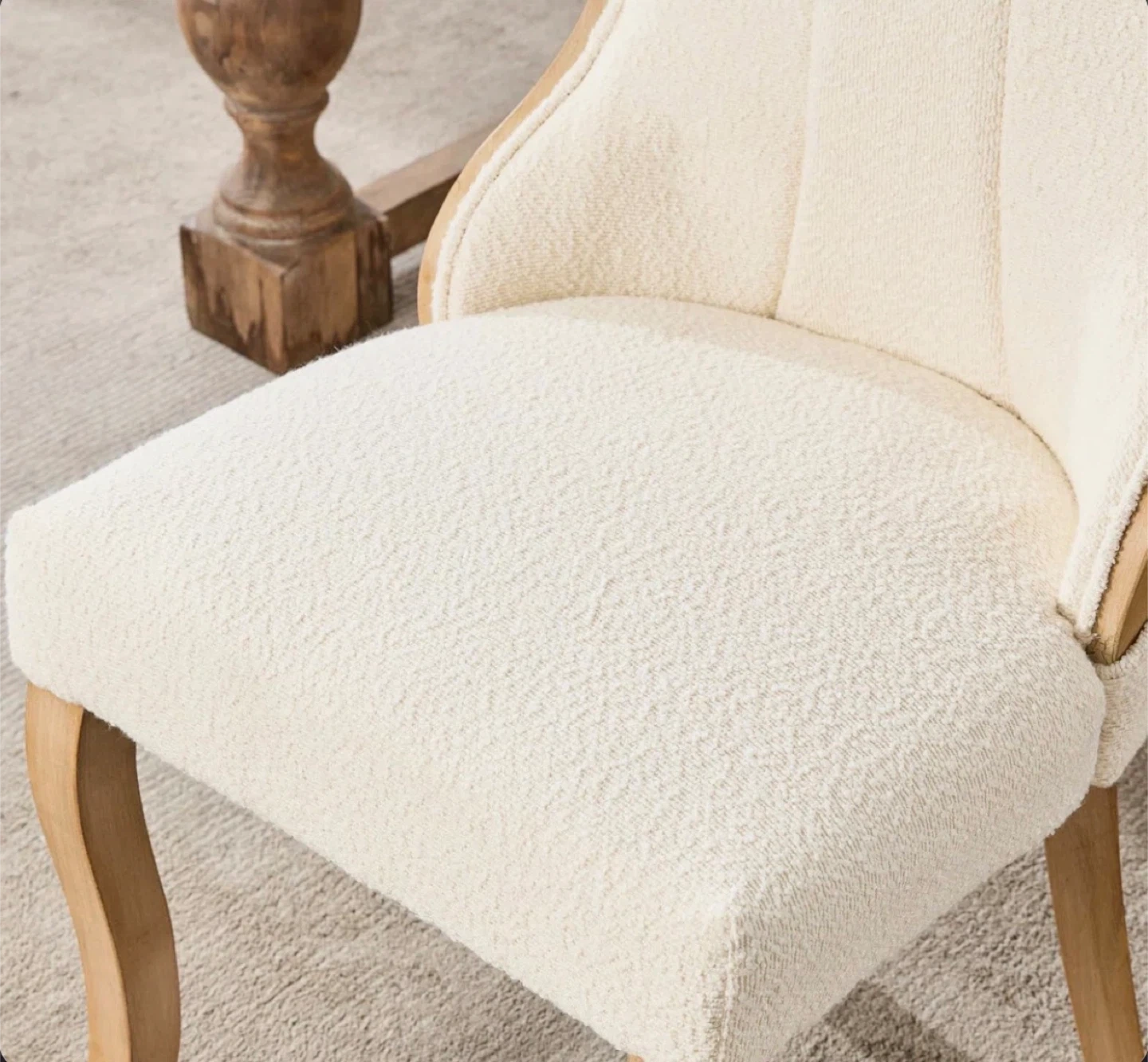 Comfy dining chairs featuring a soft boucle fabric upholstery. They have sturdy wooden legs and a curved back for support. These chairs are a nice addition to any dining room!
