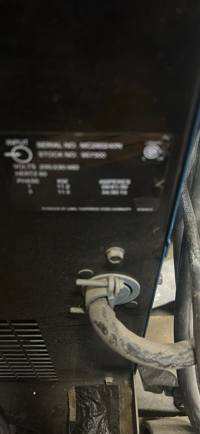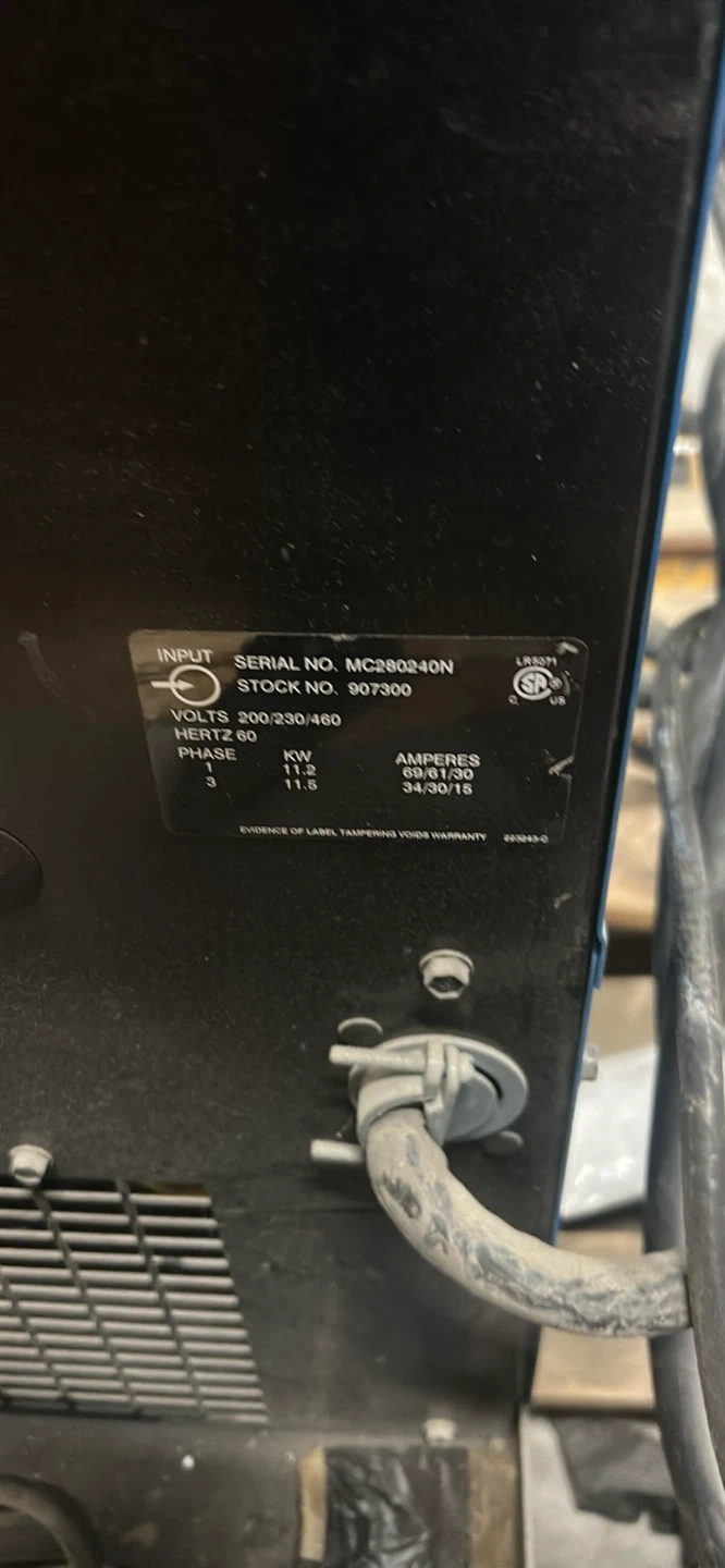 Miller Millermatic 350P welder. Input voltage 200/230V, 60Hz. Phase 3. Amperes 60/61.5A, 34/30.5A. Ideal for professional welding applications.
