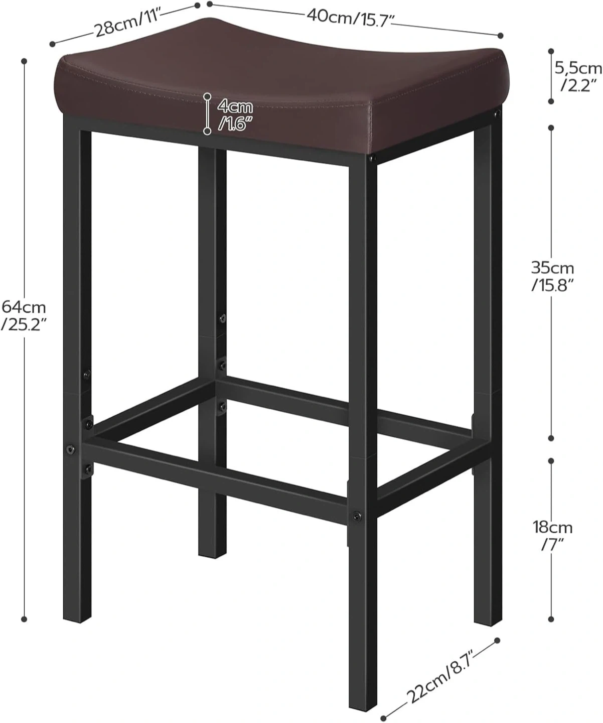 Brown faux leather saddle seats with black metal frames. Seat dimensions are 40cm/15.7" wide by 28cm/11" deep, with a seat height of 64cm/25.2". These stools are great for a kitchen counter or bar area!