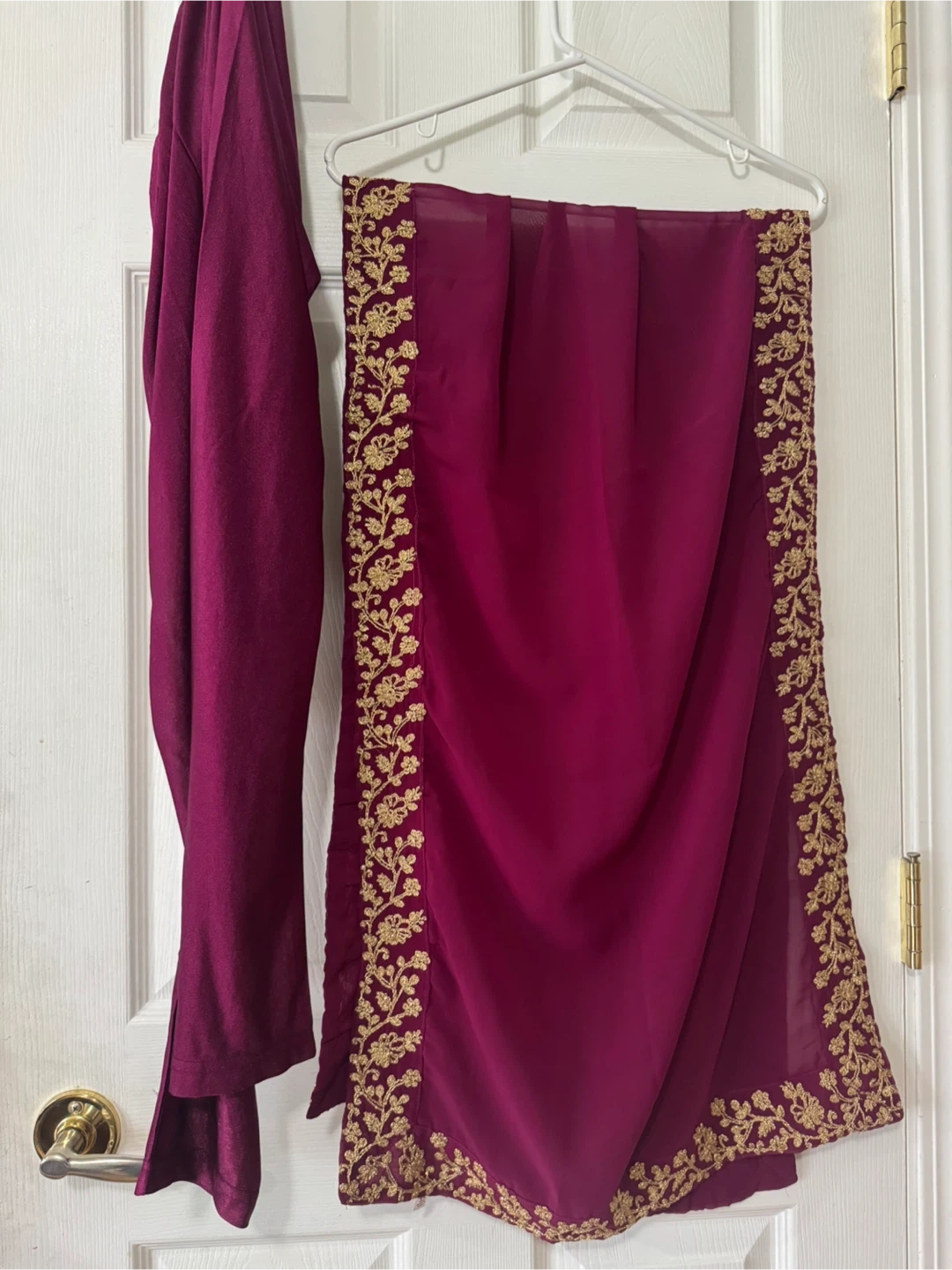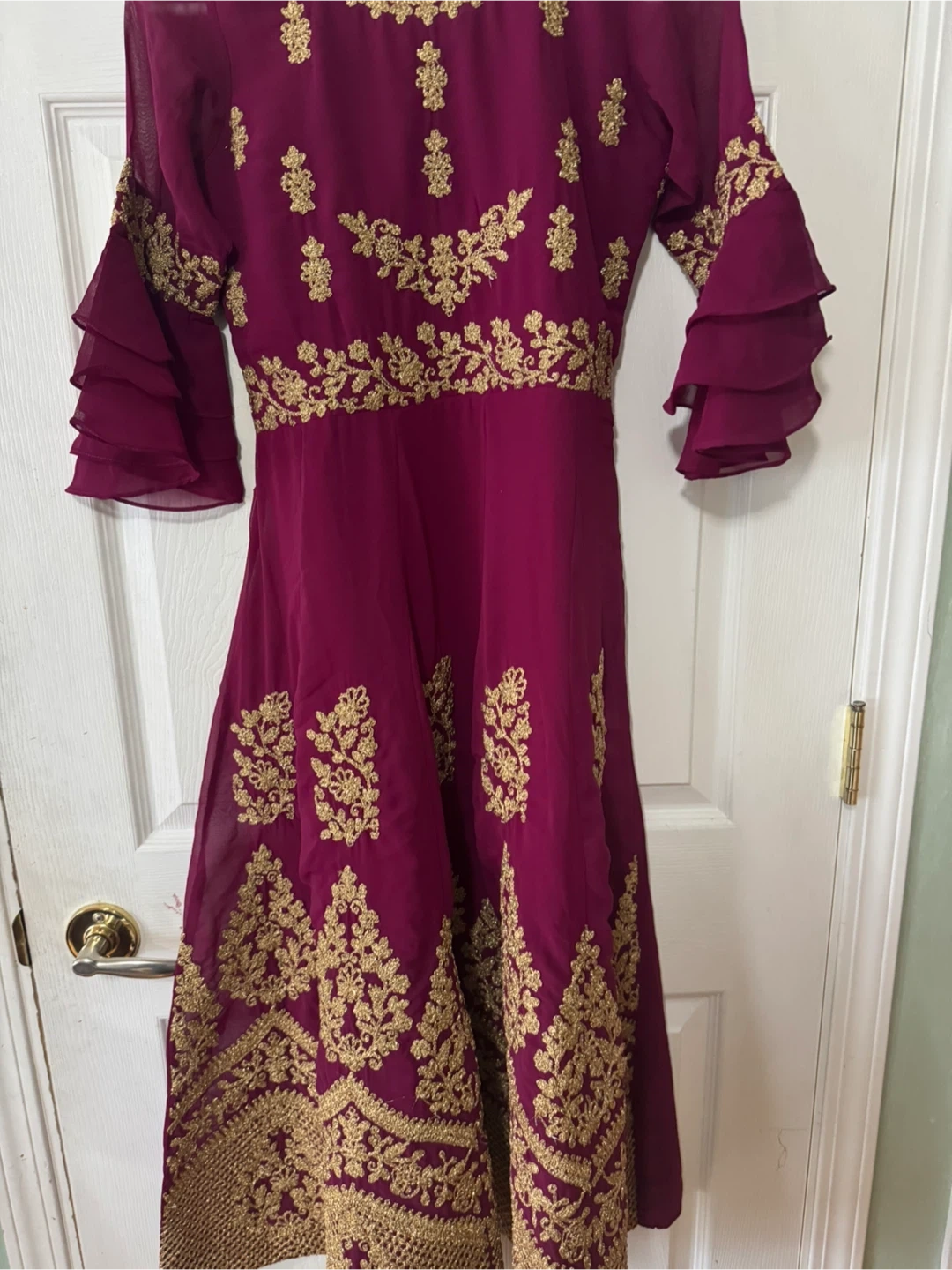 This is a lovely purple Anarkali suit with intricate gold embroidery. It features decorative bell sleeves and comes with a matching dupatta. The fabric is lightweight and flowy.
