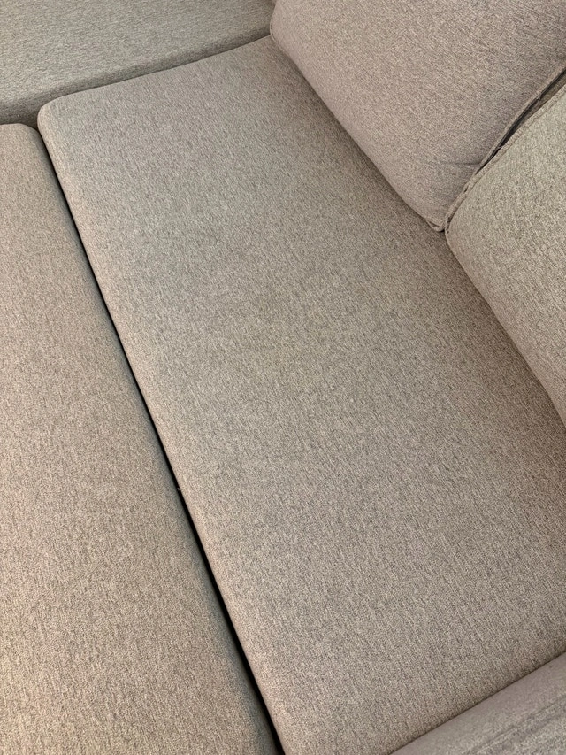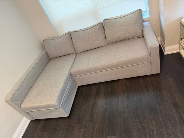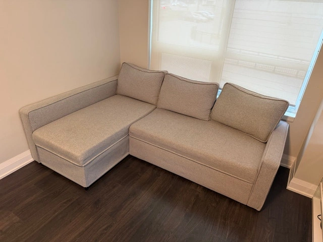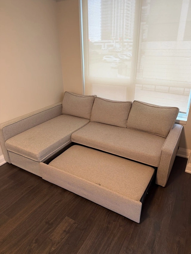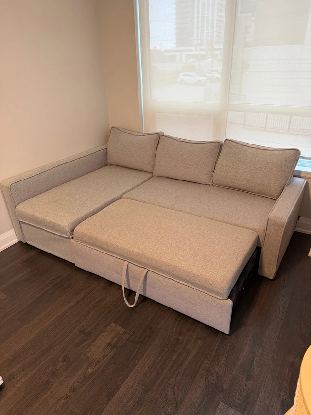 Refresh your living room with this versatile sectional that does double duty. By day it’s a comfy corner sofa that seats three-plus; by night the pull-out platform turns it into a guest-ready bed. The chaise lifts to reveal a deep storage box—ideal for stowing extra duvets, pillows or board-game night supplies. All three back cushions have zip-off, machine-washable covers for easy cleaning. Reason for selling: we need a much bigger one for a new house. Condition: very good! 8 out of 10.