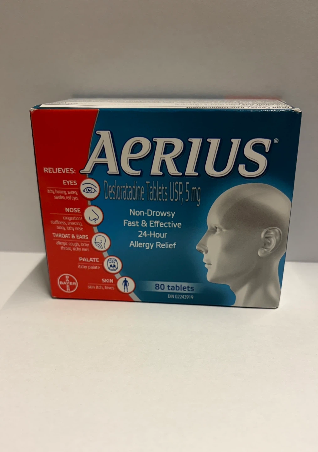 Aerius Desloratadine Tablets USP offer fast and effective non-drowsy, 24-hour allergy relief. Each tablet contains 5 mg of the active ingredient, Desloratadine. This box contains 80 tablets.